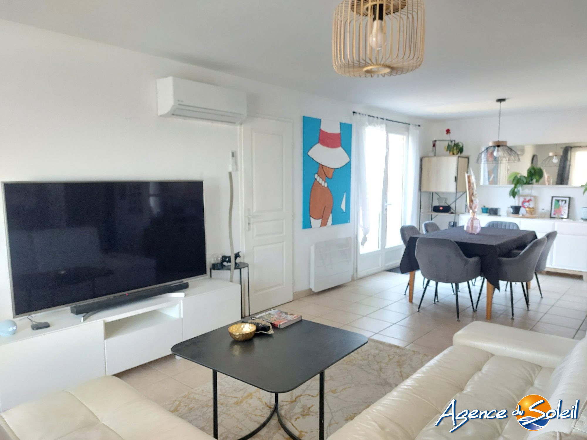 Rare!!! village proche du péage de l'A9. Villa de plain pied idéalement agencée, composée d'une cuisine équipée ouverte sur le séjour de près de 40m², 3 chambres avec placard, SDB, garage sur un terrain de 410 m² bien exposé avec piscine.