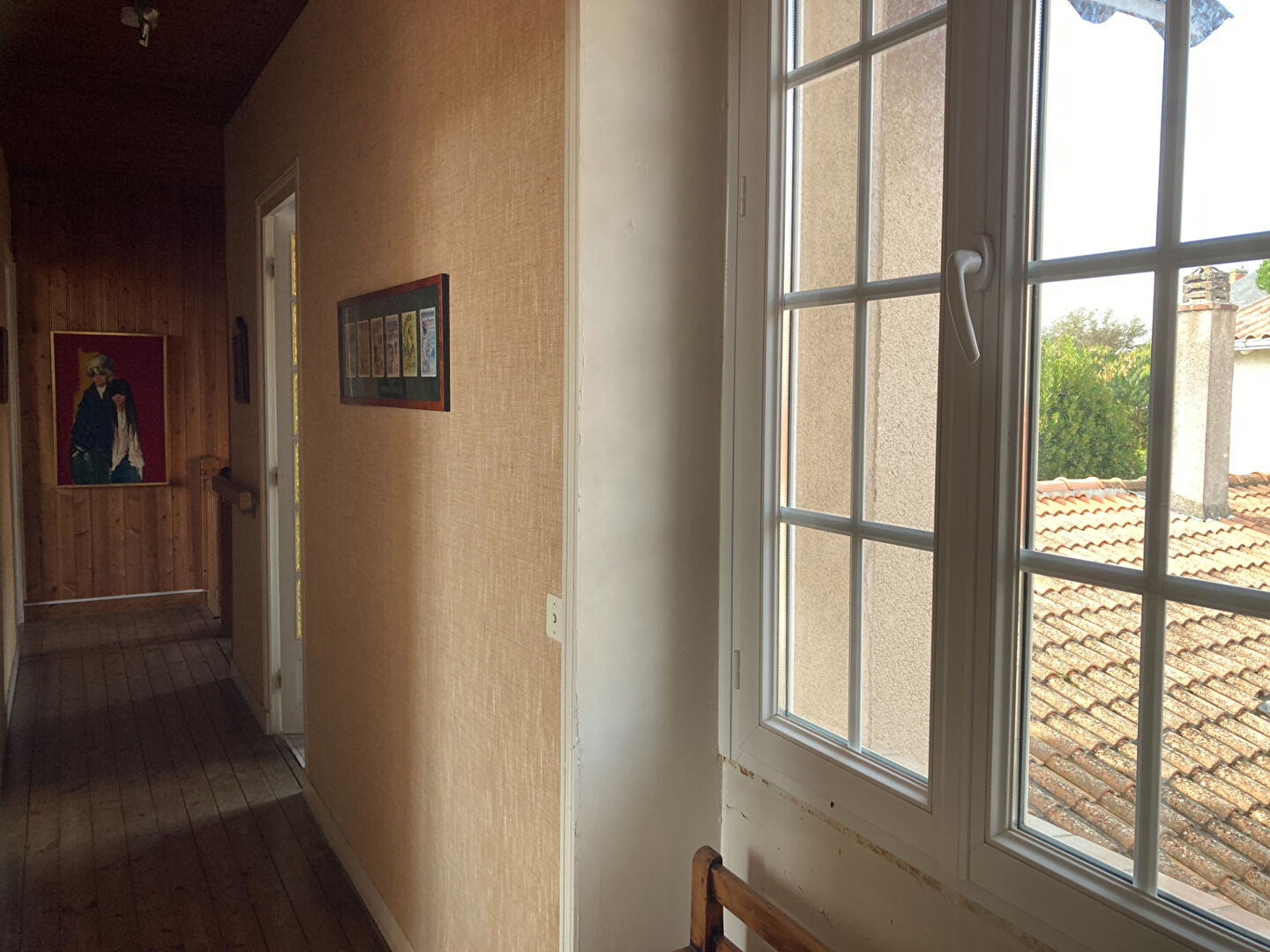 Entrée, séjour traversant avec cheminée, cuisine dans la continuité, wc.