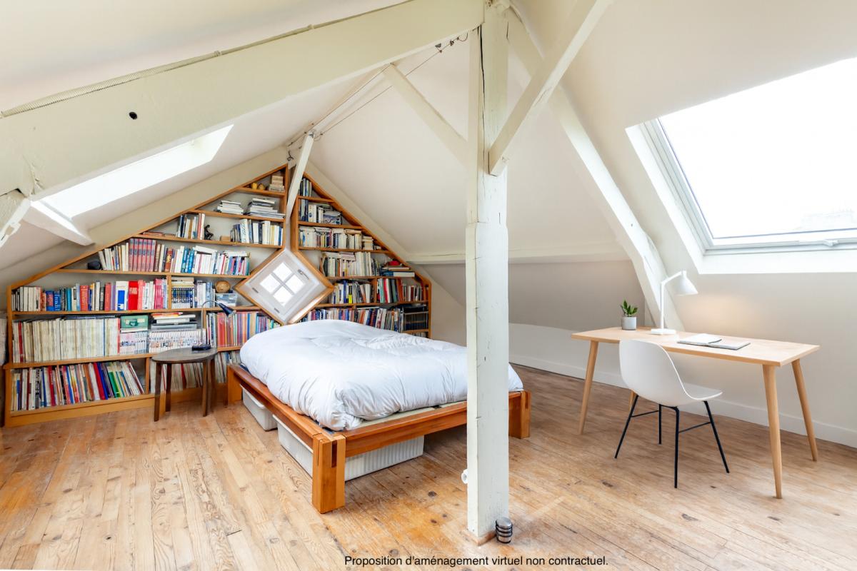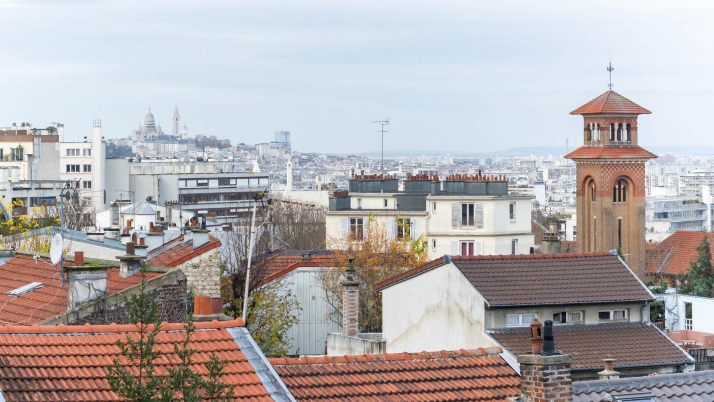 Une charmante chambre parentale sous les toits, disposant d'un point d'eau et offrant une jolie vue dégagée sur les toits et le Sacré-Coeur au loin.