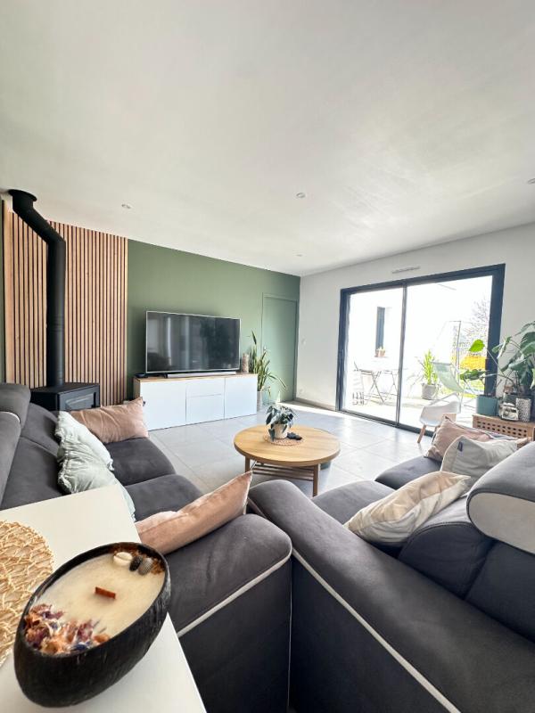 Dès l'entrée, on respire : les volumes sont ouverts, la lumière naturelle s'invite généreusement dans la pièce de vie, orientée plein sud. La cuisine sobre et actuelle s'intègre parfaitement à l'ensemble, dans une belle continuité. Un poêle à bois, judicieusement placé, ajoute cette petite note cosy qu'on aime retrouver en fin de journée.