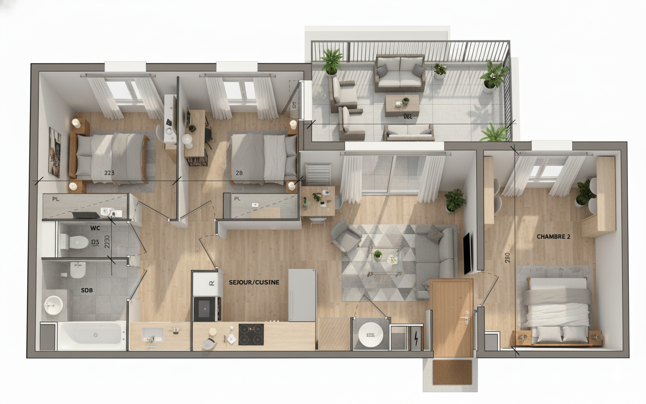 Séjour lumineux avec cuisine ouverte, 3 chambres, dont une avec accès direct à la terrasse, Salle de bain indépendante aux finitions modernes.