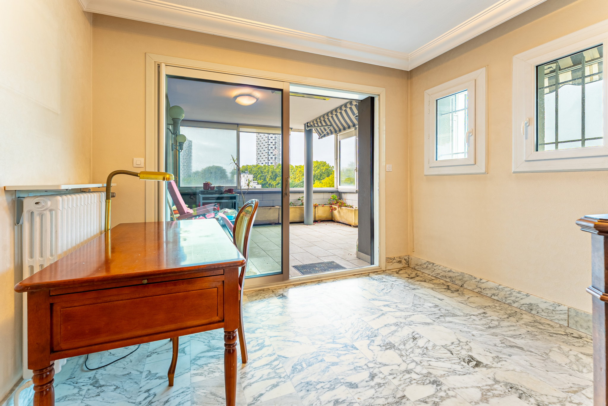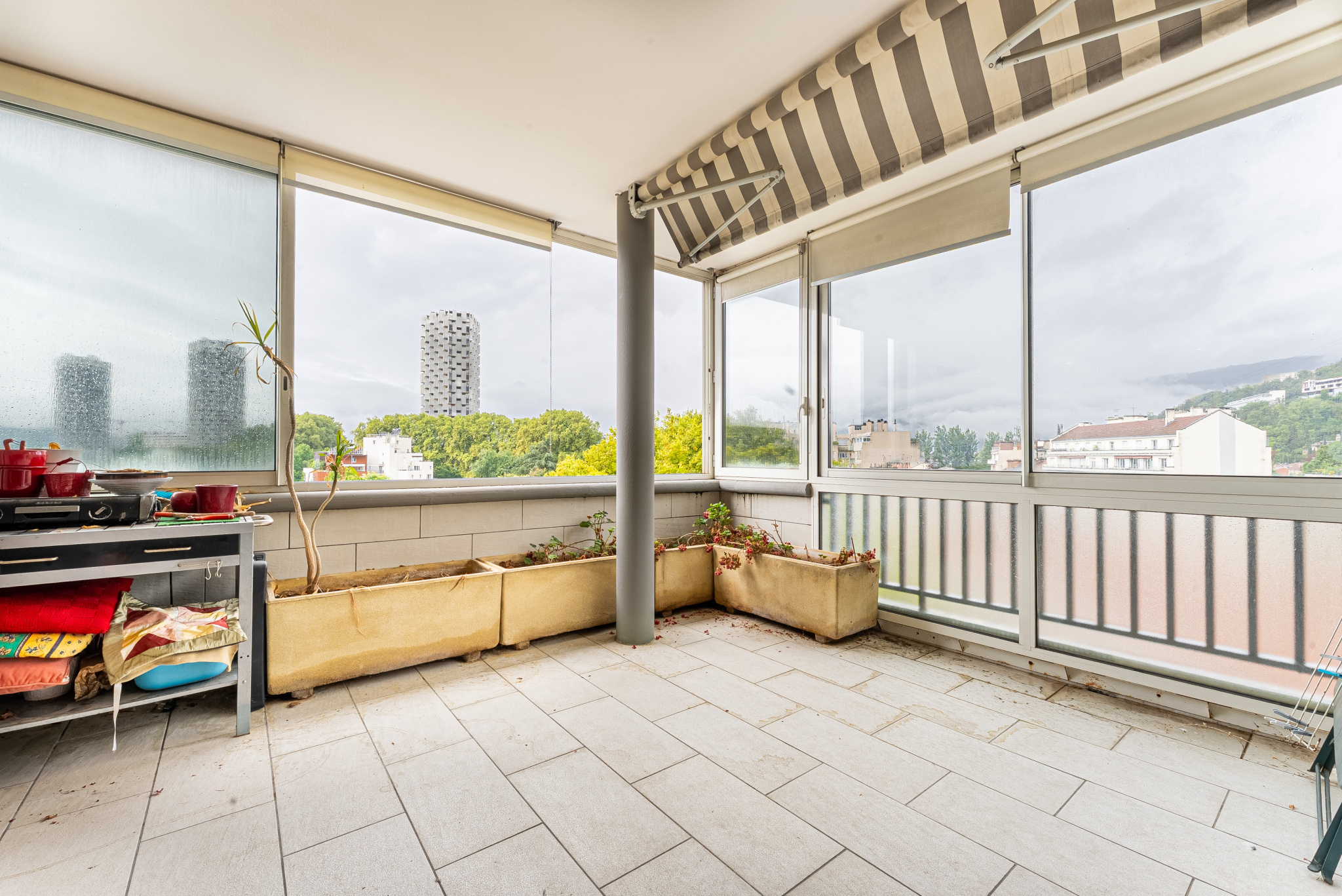 Ile Verte - dernier étage, bel appartement aux dimensions importantes pour un T4 bénéficiant d'une terrasse et d'un balcon filant assez profond avec vue sur la ville de Grenoble et les massifs environnants. Bâtiment aux normes PMR. Année de construction : fin des années 1960. Cet appartement est au dernier étage sur 6 avec un accès direct privatif dans l'appartement par ascenseur. Si cette habitation vous intéresse, - Laurent COQUET - 06 27 30 66 85 - Laurent.coquet@blain.immo se tient à votre disposition. Si vous cherchez un bien pour vivre avec toute votre famille, contactez-nous pour visiter ce domicile. L'intérieur de 119.74m2 est formé d'un coin salon de 29.04m2, un espace nuit comprenant 3 chambres et un espace cuisine. Pour le bien-être de la famille, une salle de bains et une douche séparée vous éviteront de vous battre pour aller prendre une douche. Le bien s'accompagne de 2 caves. La tranquillité des occupants est assurée grâce aux fenêtres à double vitrage. Pour prendre l'air, vous aurez accès à un balcon extérieur mesurant 33m2 et une terrasse d'une surface de 15.3m2 couverte avec baies coulissantes et climatisation, ce qui amène la superficie à vivre à 168.04m2. Pour ce qui est de la taxe foncière, elle s'élève à 3 700 EUR. Possibilité d'acquérir garage dans la résidence pour un coût de 21 000EUR. Les honoraires sont à la charge du vendeur