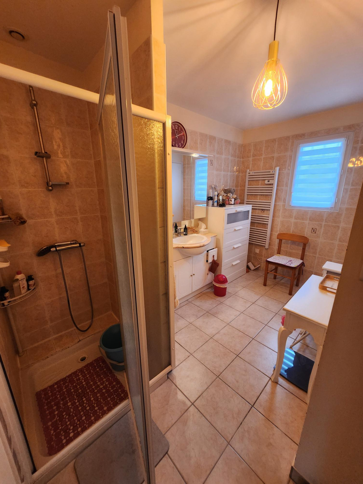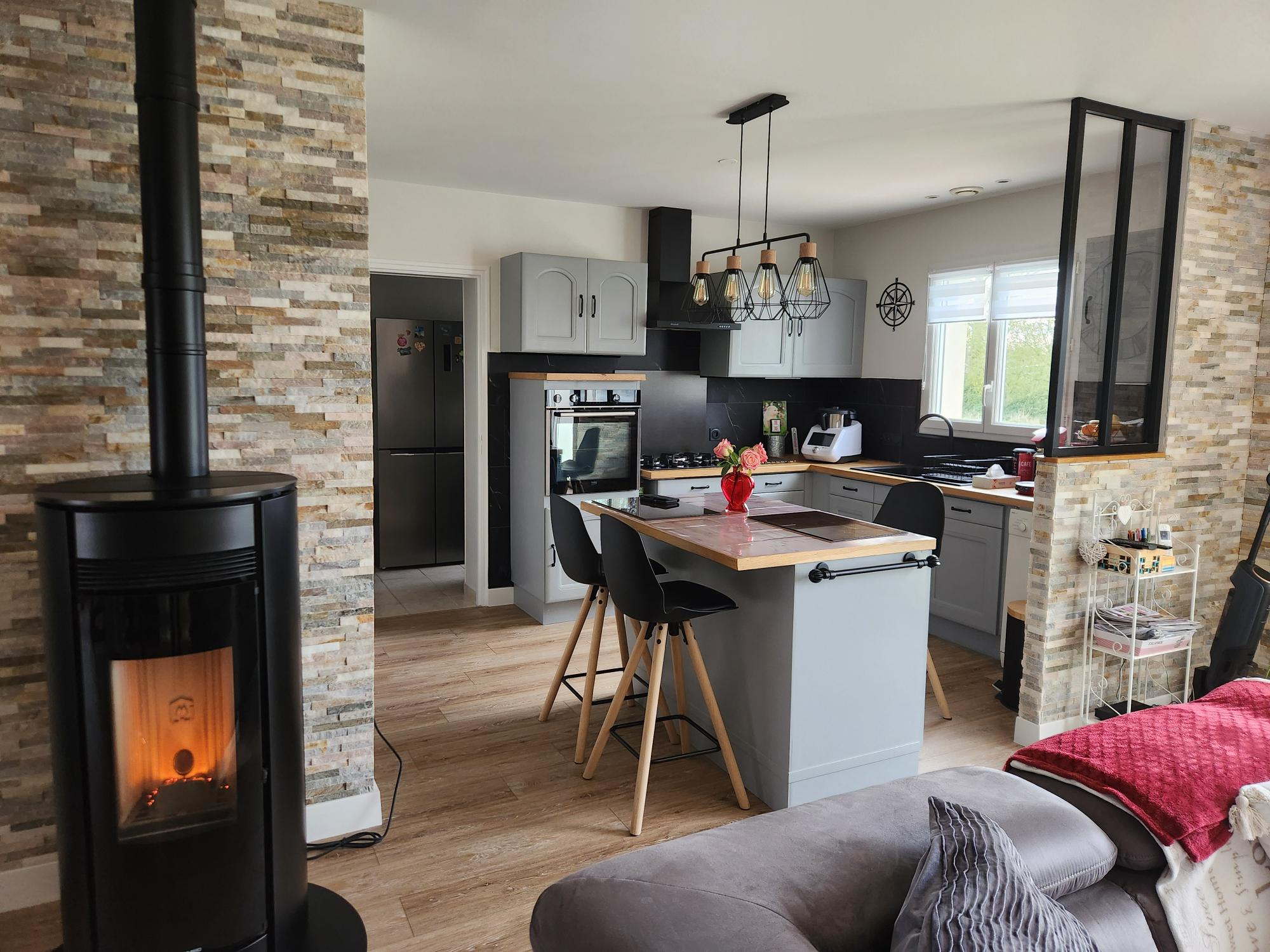 superbe état et très belle exposition pour cette ville de 96 m2 habitables avec une vaste pièce de vie, cuisine aménagée ouverte, trois chambres, salle d'eau spacieuse, cellier + garage avec faux grenier. chauffage poële à granules + appoint électrique.