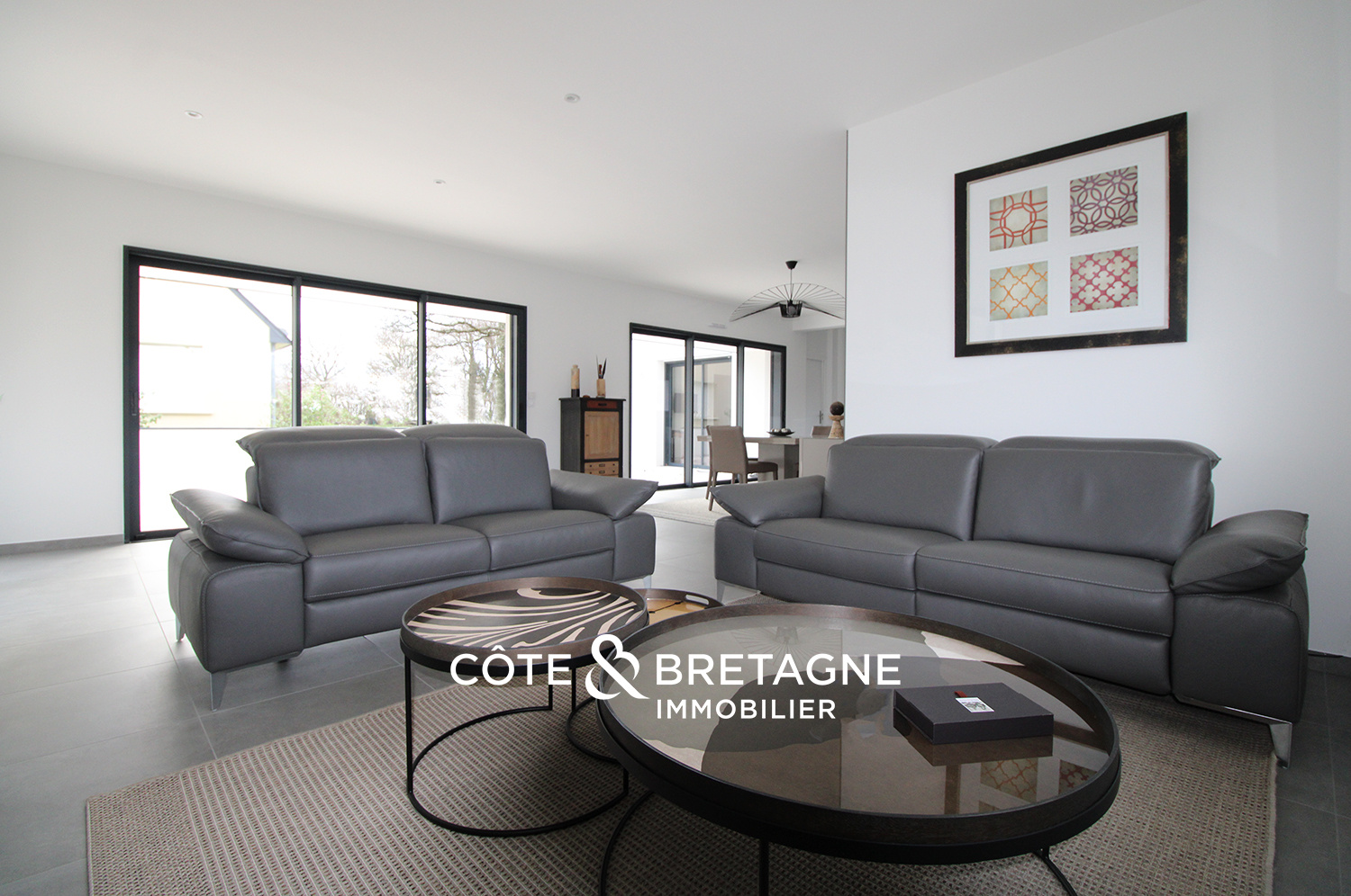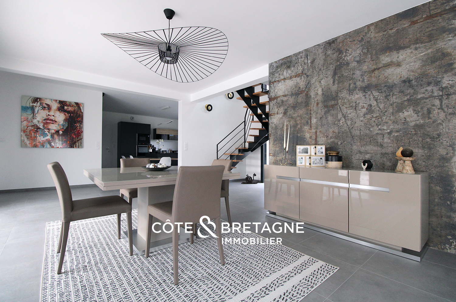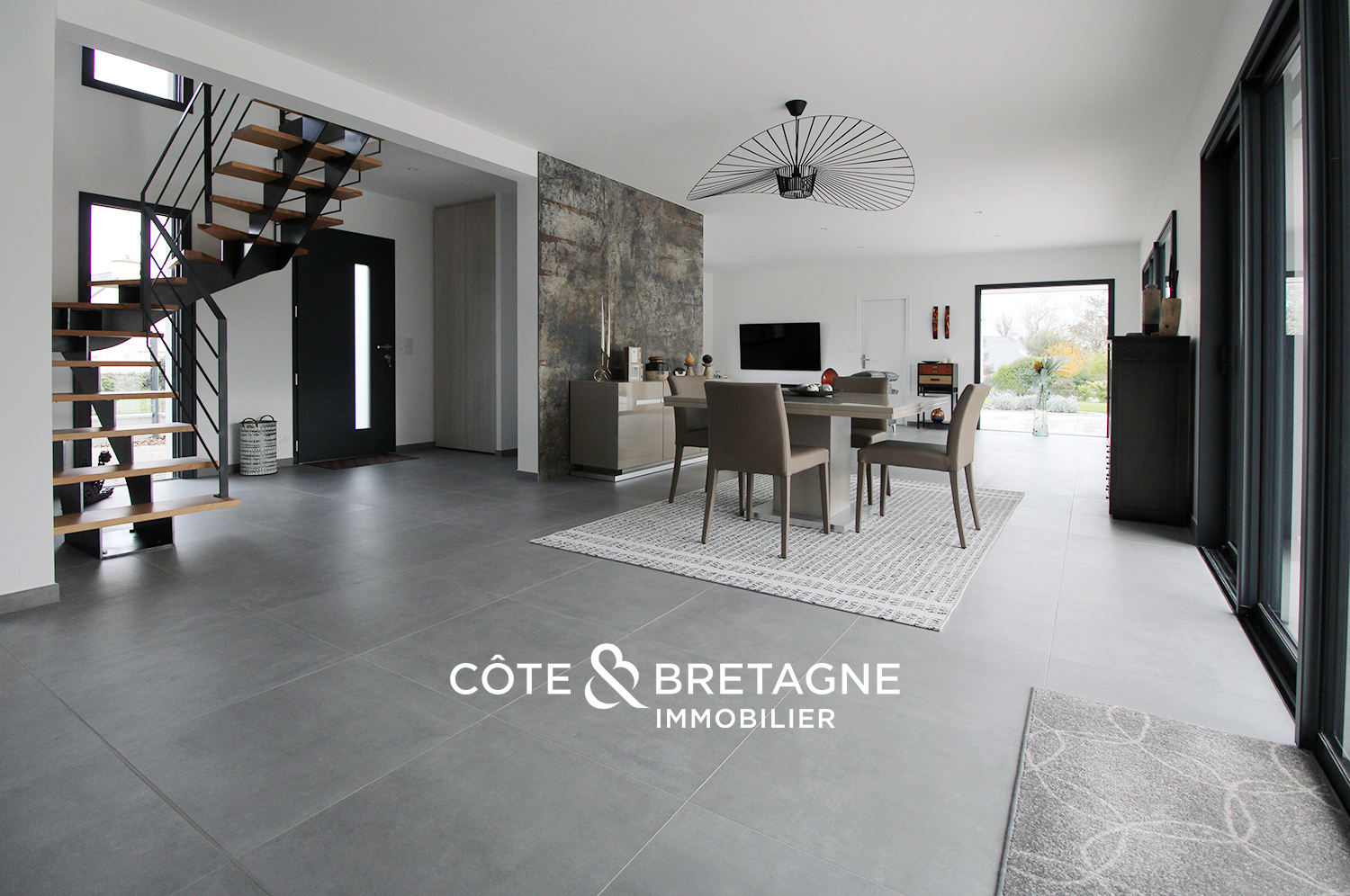 CÔTE ET BRETAGNE IMMOBILIER VOUS PROPOSE ÉLÉGANCE ET HARMONIE. Idéalement située sur la commune de Sarzeau, dans le village pittoresque de Penvins et à seulement 600 mètres de la plage, cette maison d'architecte moderne saura vous séduire par ses volumes généreux et ses prestations de haut standing. Édifiée en 2022 sur un terrain d'environ 900 m2, cette propriété aux lignes sobres et épurées offre une surface habitable de 192 m2. Un hall d'entrée spacieux et accueillant. Dès votre arrivée, le hall d'entrée vous accueillera avec une belle hauteur sous plafond de 2,60 mètres, créant une atmosphère d'espace et de luminosité. Il invite à découvrir une vaste pièce de vie, baignée de lumière tout au long de la journée grâce à de majestueuses baies vitrées équipées de BSO électriques. Ces baies vitrées offrent un accès direct à la grande terrasse, idéalement orientée Sud-Ouest. Une vie intérieure-extérieure harmonisée. La maison a été conçue pour permettre une vie harmonieuse entre les espaces intérieurs et extérieurs. L'agencement ouvert favorise une circulation fluide, tout en offrant des zones distinctes sans être cloisonnées. En face des baies vitrées, un mur en grandes dalles de carrelage, ajoute une touche unique à la décoration. Cuisine ouverte et fonctionnelle. La cuisine ouverte, tout en étant protégée des regards, se présente comme le second coeur de la maison. Elle est dotée d'une table suspendue et d'une verrière atelier qui abrite un cellier. Pour plus de commodité, une chambre avec placard, salle d'eau et toilettes permet une vie de plain-pied avec accès direct à la terrasse. Mezzanine et espaces de nuit supplémentaires. L'escalier suspendu en bois et métal, réalisé sur mesure, mène à une mezzanine aménageable selon vos envies : bureau, salon télé, ou salle de jeux. Cette mezzanine ouvre sur deux chambres. La première chambre dispose d'un placard, d'une salle d'eau avec WC. La seconde chambre, quant à elle, présente un grand dressing, une salle d'eau, des WC indépendants, et un accès à un spacieuce terrasse. Toutes les salles d'eau sont équipées de larges douches à l'italienne. Cette maison contemporaine, en plus de ses nombreux équipements, dispose d'un garage spacieux, entièrement isolé et carrelé, ainsi que d'un puits alimentant les extérieurs. Sur le plan technique, elle est équipée d'un plancher chauffant et rafraîchissant sur les deux étages. Bénéficiant de matériaux de qualité et de finitions soignées, cette maison est à la fois économe et respectueuse de l'environnement, avec un double A pour la consommation d'énergie et les émissions de gaz à effet de serre. Une localisation idéale à Sarzeau. Ce véritable coup de coeur se situe à Sarzeau, une petite cité au coeur de la presqu'île, qui témoigne de sa forte identité bretonne à travers ses hameaux et ses petits chemins de randonnée accessibles directement depuis la maison. Admirez l'étendue de la pointe de Penvins, profitez de promenades sur la digue avec des vues imprenables sur l'océan, et explorez les plages et le cordon dunaire. Les amateurs de promenades à pied ou à vélo, ainsi que les passionnés de sports nautiques, seront comblés. De plus, vous bénéficiez d'un dépaysement assuré à moins de 30 minutes de Vannes, avec toutes les commodités pour un confort de vie optimal : commerces, restaurants, boutiques, marchés, médiathèque et services de santé. Cette annonce vous est proposée par Laurence MEUNIER | Tel :06 21 98 61 34. Agent commercial Vannes Morbihan, immatriculé au R.S.A.C de Vannes sous le no 842 995 599 Votre Agence immobilière de prestige Saint-Brieuc, Golfe du Morbihan, Côte des Mégalithes, Bord de Mer, Vannes, Carnac, Lorient. CLASSE ÉNERGIE : A / CLASSE CLIMAT : A. Montant moyen estimé des dépenses annuelles d'énergie pour un usage standard, établi à partir des prix de l'énergie de l'année 2021 : entre 600 EUR et 860 EUR Les informations sur les risques auxquels ce bien est exposé sont disponibles sur le site Géorisques : www.georisques.gouv.fr Prix : 1 038 000 EUR Honoraires inclus | 1 000 000 EUR hors honoraires. Honoraires : 3.8 % TTC à la charge de l'acquéreur.
