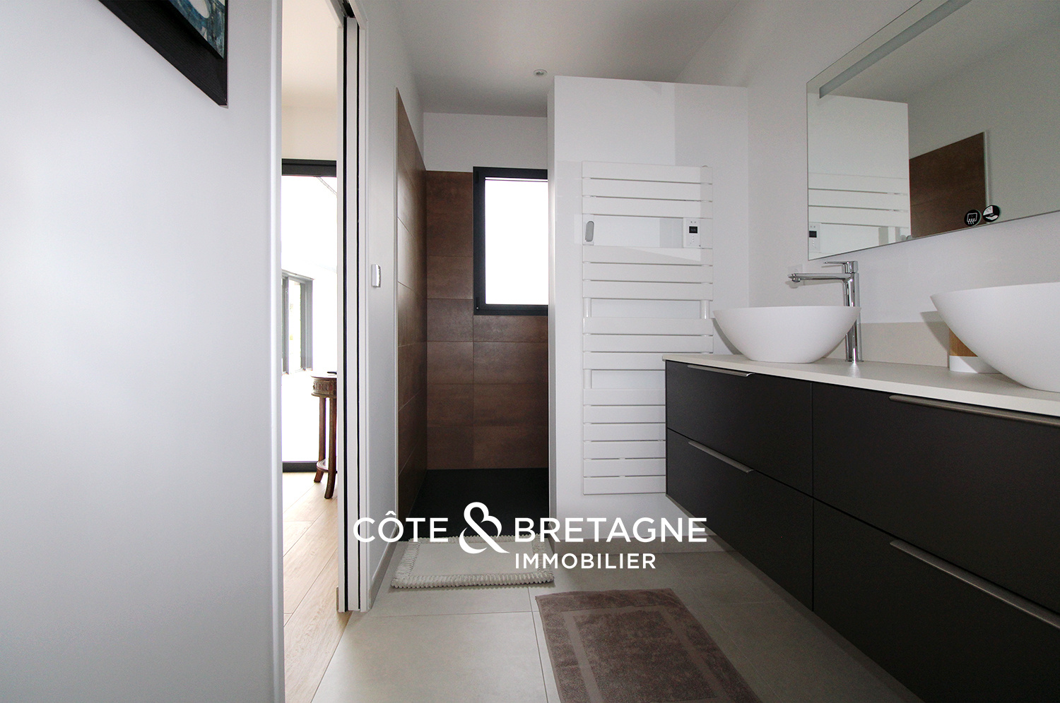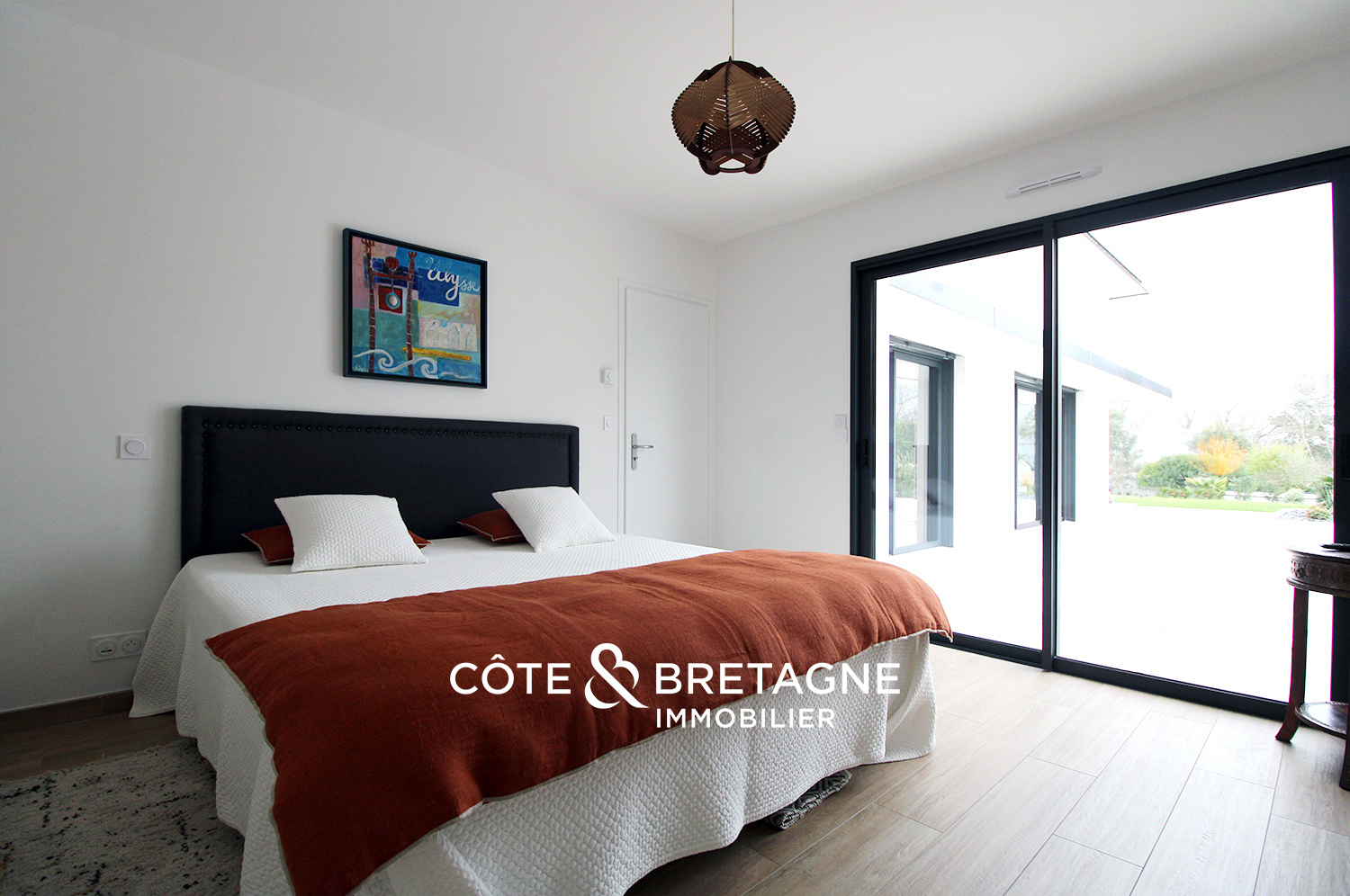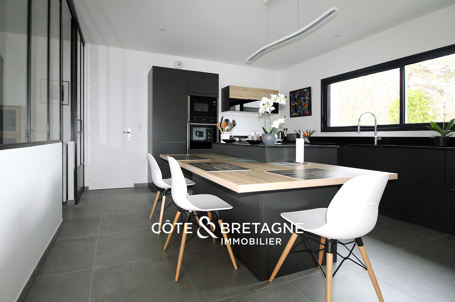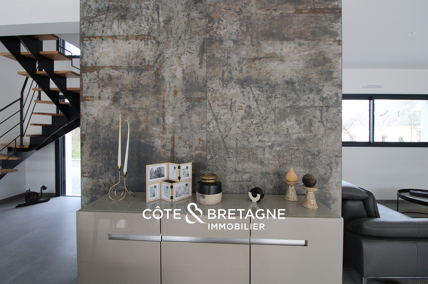 CÔTE ET BRETAGNE IMMOBILIER VOUS PROPOSE ÉLÉGANCE ET HARMONIE. Idéalement située sur la commune de Sarzeau, dans le village pittoresque de Penvins et à seulement 600 mètres de la plage, cette maison d'architecte moderne saura vous séduire par ses volumes généreux et ses prestations de haut standing. Édifiée en 2022 sur un terrain d'environ 900 m2, cette propriété aux lignes sobres et épurées offre une surface habitable de 192 m2. Un hall d'entrée spacieux et accueillant. Dès votre arrivée, le hall d'entrée vous accueillera avec une belle hauteur sous plafond de 2,60 mètres, créant une atmosphère d'espace et de luminosité. Il invite à découvrir une vaste pièce de vie, baignée de lumière tout au long de la journée grâce à de majestueuses baies vitrées équipées de BSO électriques. Ces baies vitrées offrent un accès direct à la grande terrasse, idéalement orientée Sud-Ouest. Une vie intérieure-extérieure harmonisée. La maison a été conçue pour permettre une vie harmonieuse entre les espaces intérieurs et extérieurs. L'agencement ouvert favorise une circulation fluide, tout en offrant des zones distinctes sans être cloisonnées. En face des baies vitrées, un mur en grandes dalles de carrelage, ajoute une touche unique à la décoration. Cuisine ouverte et fonctionnelle. La cuisine ouverte, tout en étant protégée des regards, se présente comme le second coeur de la maison. Elle est dotée d'une table suspendue et d'une verrière atelier qui abrite un cellier. Pour plus de commodité, une chambre avec placard, salle d'eau et toilettes permet une vie de plain-pied avec accès direct à la terrasse. Mezzanine et espaces de nuit supplémentaires. L'escalier suspendu en bois et métal, réalisé sur mesure, mène à une mezzanine aménageable selon vos envies : bureau, salon télé, ou salle de jeux. Cette mezzanine ouvre sur deux chambres. La première chambre dispose d'un placard, d'une salle d'eau avec WC. La seconde chambre, quant à elle, présente un grand dressing, une salle d'eau, des WC indépendants, et un accès à un spacieuce terrasse. Toutes les salles d'eau sont équipées de larges douches à l'italienne. Cette maison contemporaine, en plus de ses nombreux équipements, dispose d'un garage spacieux, entièrement isolé et carrelé, ainsi que d'un puits alimentant les extérieurs. Sur le plan technique, elle est équipée d'un plancher chauffant et rafraîchissant sur les deux étages. Bénéficiant de matériaux de qualité et de finitions soignées, cette maison est à la fois économe et respectueuse de l'environnement, avec un double A pour la consommation d'énergie et les émissions de gaz à effet de serre. Une localisation idéale à Sarzeau. Ce véritable coup de coeur se situe à Sarzeau, une petite cité au coeur de la presqu'île, qui témoigne de sa forte identité bretonne à travers ses hameaux et ses petits chemins de randonnée accessibles directement depuis la maison. Admirez l'étendue de la pointe de Penvins, profitez de promenades sur la digue avec des vues imprenables sur l'océan, et explorez les plages et le cordon dunaire. Les amateurs de promenades à pied ou à vélo, ainsi que les passionnés de sports nautiques, seront comblés. De plus, vous bénéficiez d'un dépaysement assuré à moins de 30 minutes de Vannes, avec toutes les commodités pour un confort de vie optimal : commerces, restaurants, boutiques, marchés, médiathèque et services de santé. Cette annonce vous est proposée par Laurence MEUNIER | Tel :06 21 98 61 34. Agent commercial Vannes Morbihan, immatriculé au R.S.A.C de Vannes sous le no 842 995 599 Votre Agence immobilière de prestige Saint-Brieuc, Golfe du Morbihan, Côte des Mégalithes, Bord de Mer, Vannes, Carnac, Lorient. CLASSE ÉNERGIE : A / CLASSE CLIMAT : A. Montant moyen estimé des dépenses annuelles d'énergie pour un usage standard, établi à partir des prix de l'énergie de l'année 2021 : entre 600 EUR et 860 EUR Les informations sur les risques auxquels ce bien est exposé sont disponibles sur le site Géorisques : www.georisques.gouv.fr Prix : 1 038 000 EUR Honoraires inclus | 1 000 000 EUR hors honoraires. Honoraires : 3.8 % TTC à la charge de l'acquéreur.