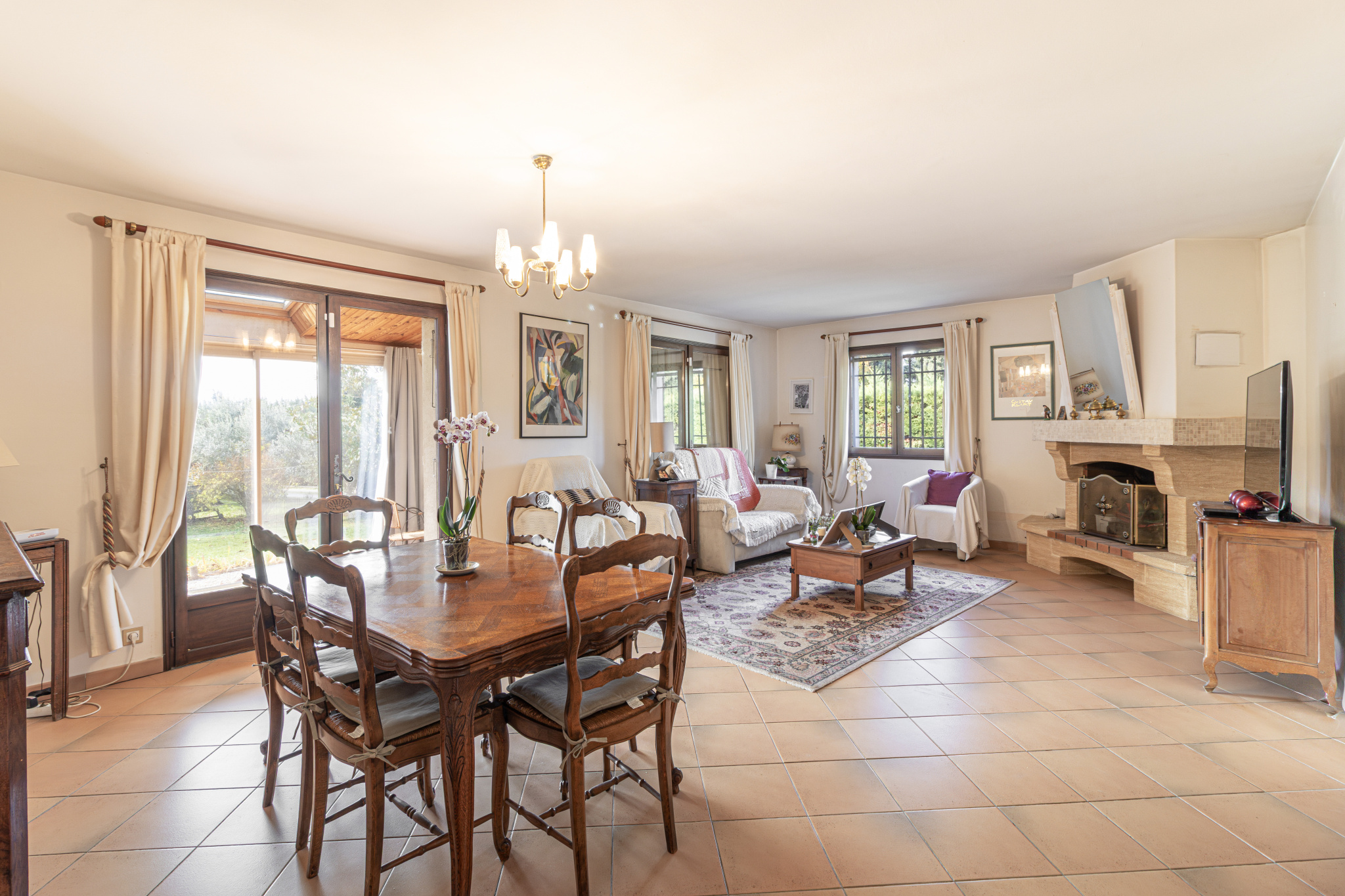 La véranda attenante prolonge naturellement le salon et devient un véritable espace de vie supplémentaire, baigné de lumière, ouvert sur le jardin ensoleillé -- un lieu idéal pour vos moments de détente en toute saison.