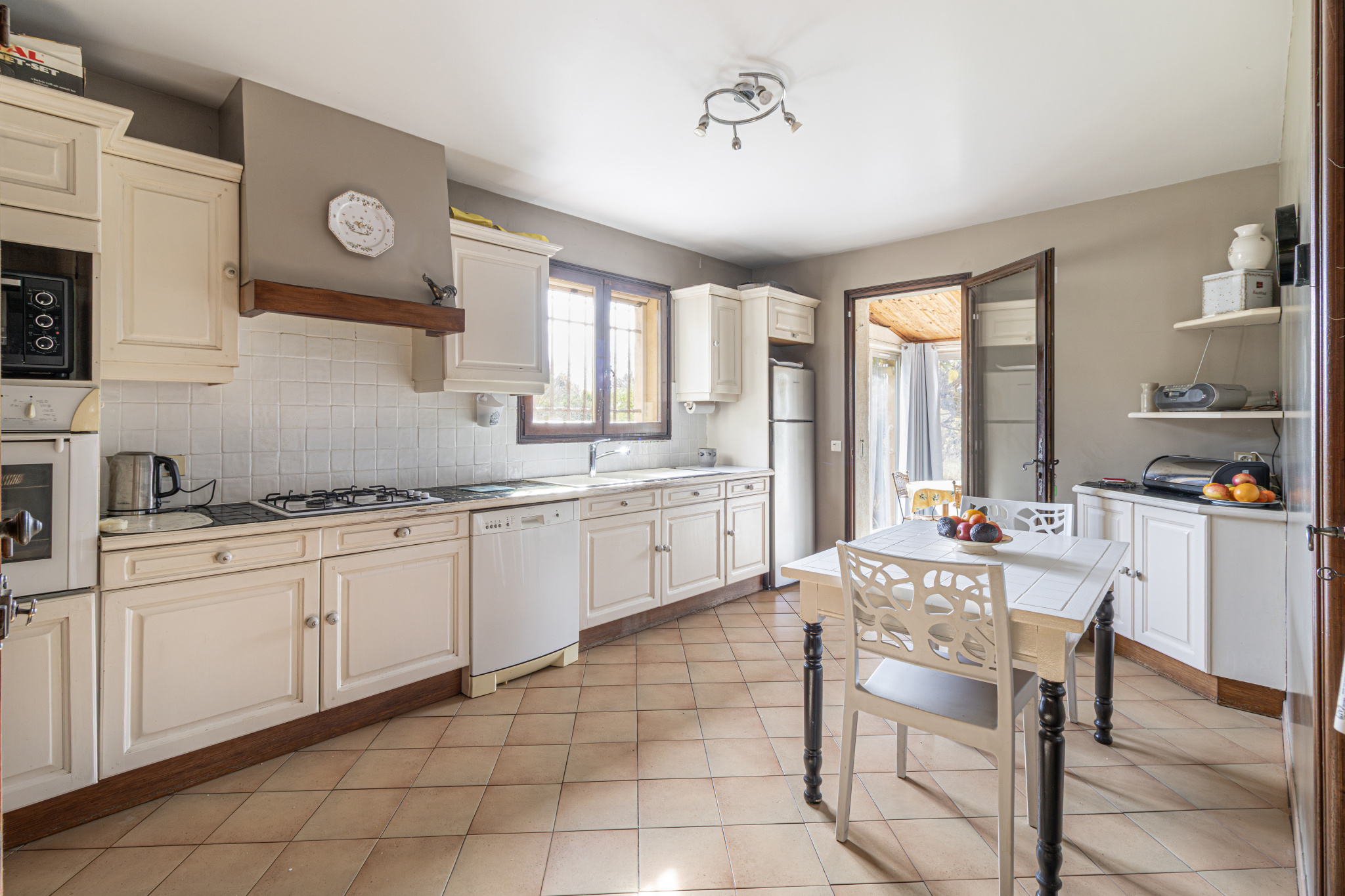 La cuisine indépendante, fonctionnelle et exposée sud, bénéficie d'un accès direct à la véranda, facilitant les repas en extérieur. Une buanderie aménagée avec douche ajoute un atout pratique supplémentaire.