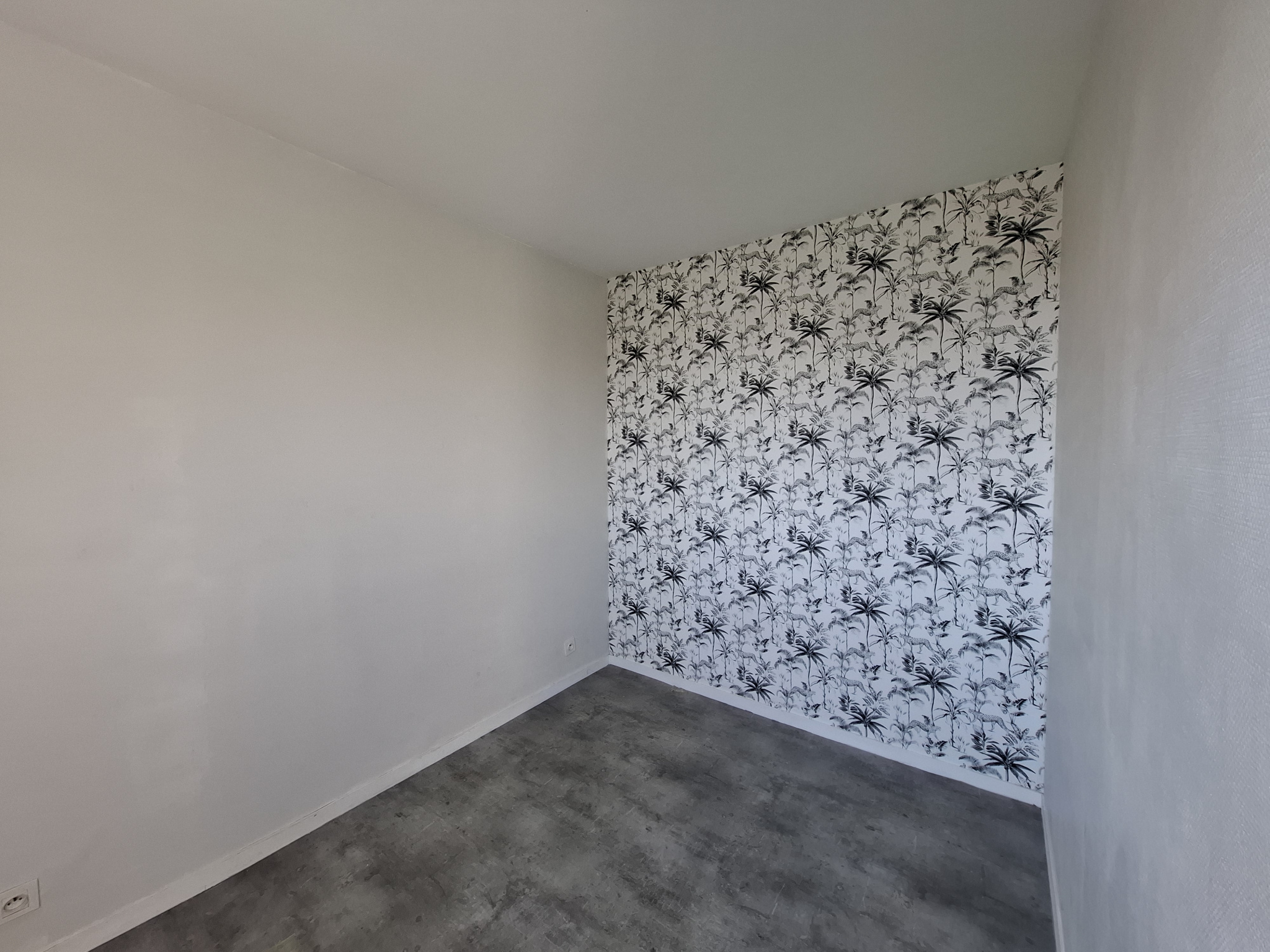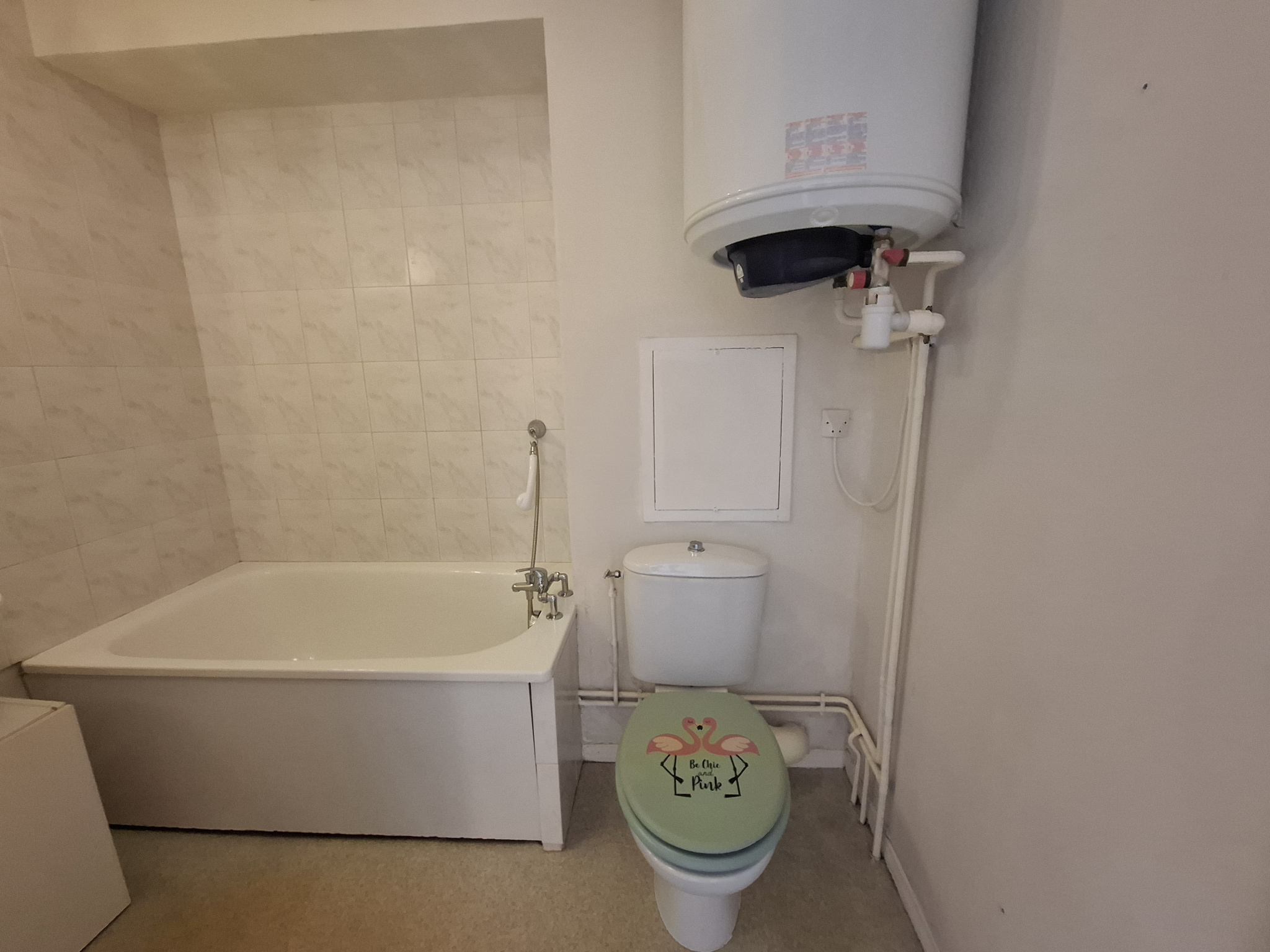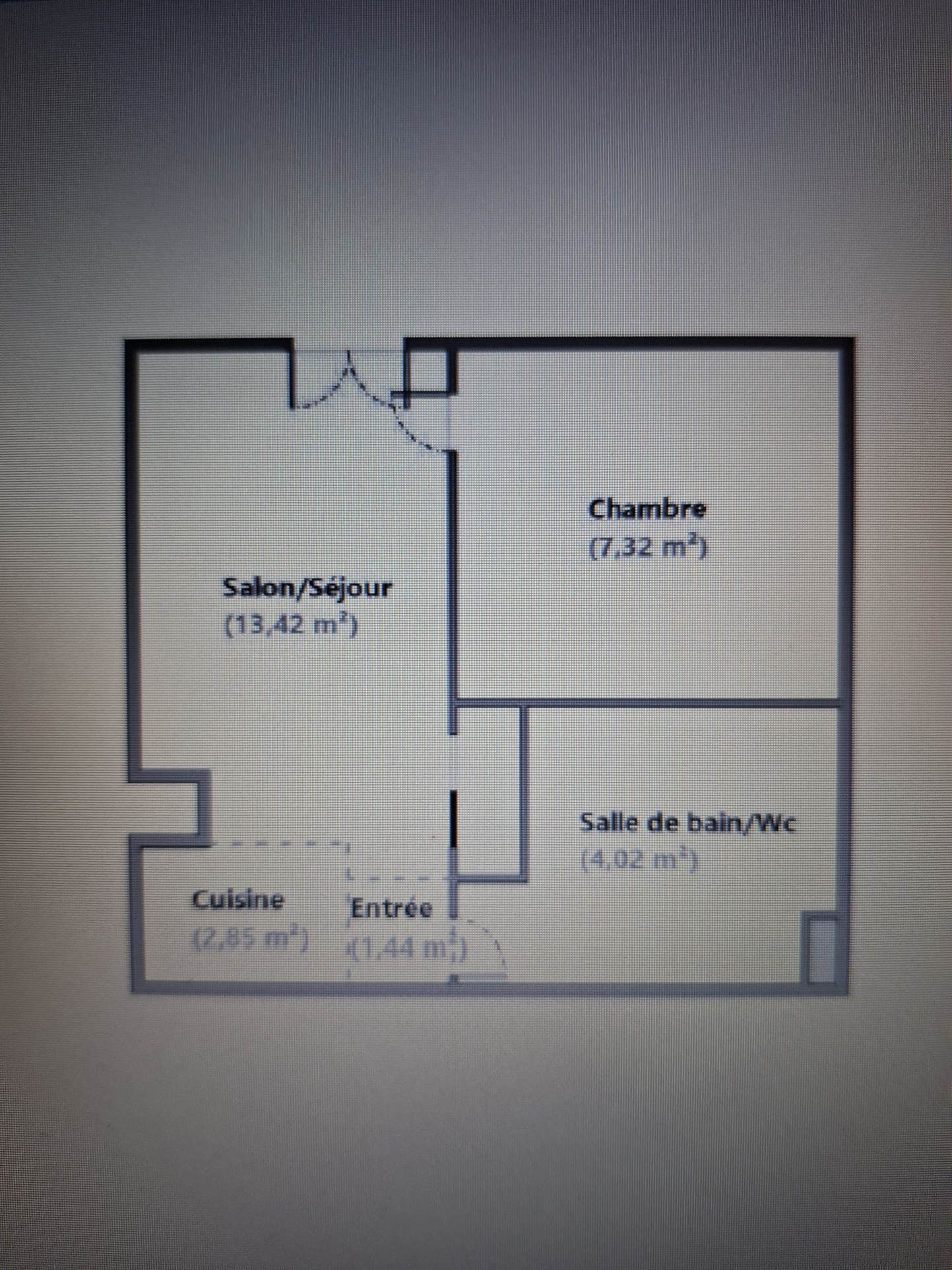 Il se compose d'une entrée de 1.44 m2 donnant sur une kitchenette semi-ouverte de 2.85 m2 avec une plaque de cuisson et un petit réfrigirateur sur un salon/séjour de 13.42 m2 avec un placard et une porte-fenêtre, d'un bureau de 7.32 m2 avec une fenêtre pouvant faire office de chambre et d'une salle de bain de 4.02 m2 avec un wc et le cumulus.