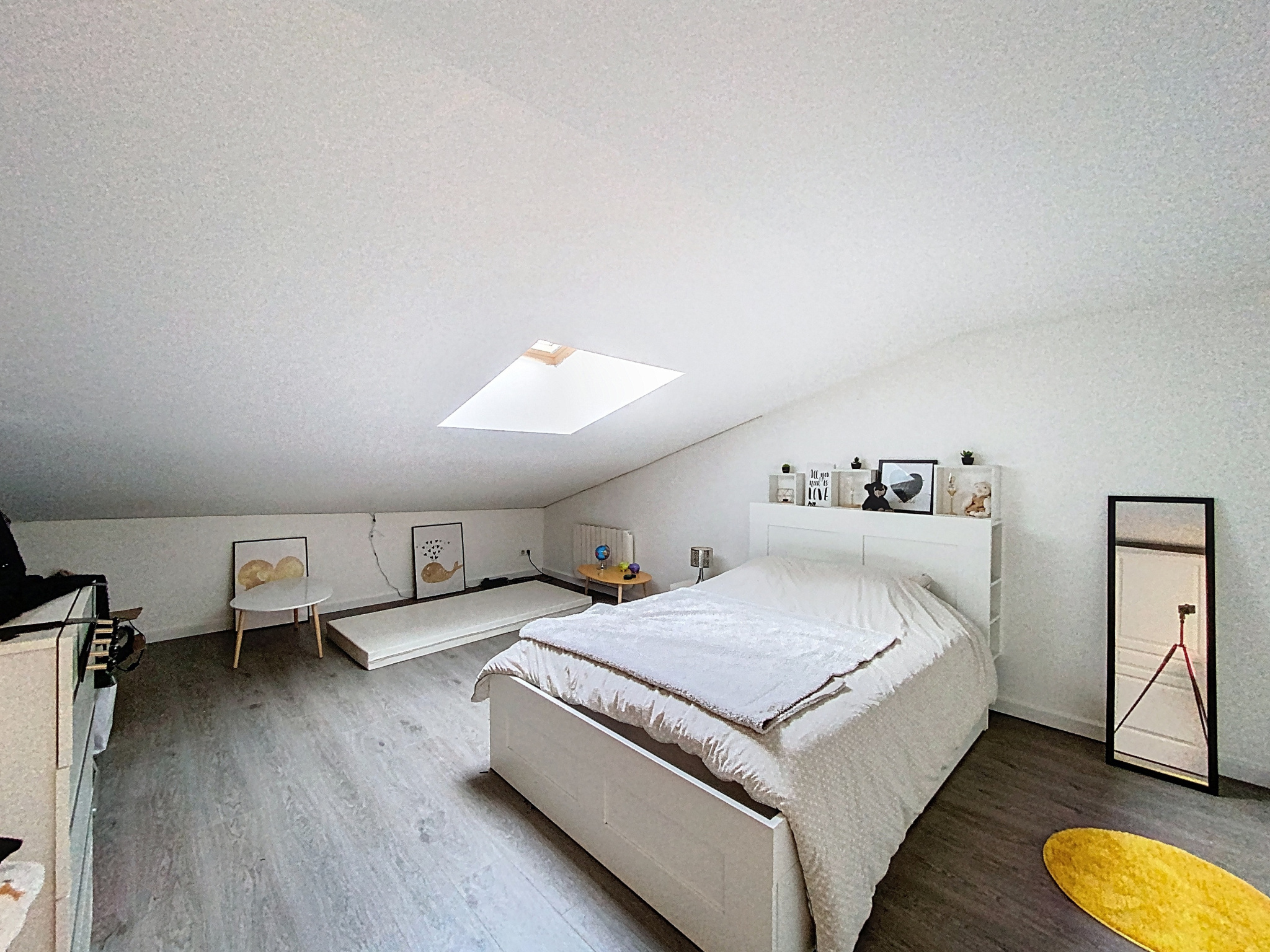 - Chambre 3 mansardée (26,80m2 au sol) : parquet flottant, ''VELUX'', radiateur électrique à inertie.