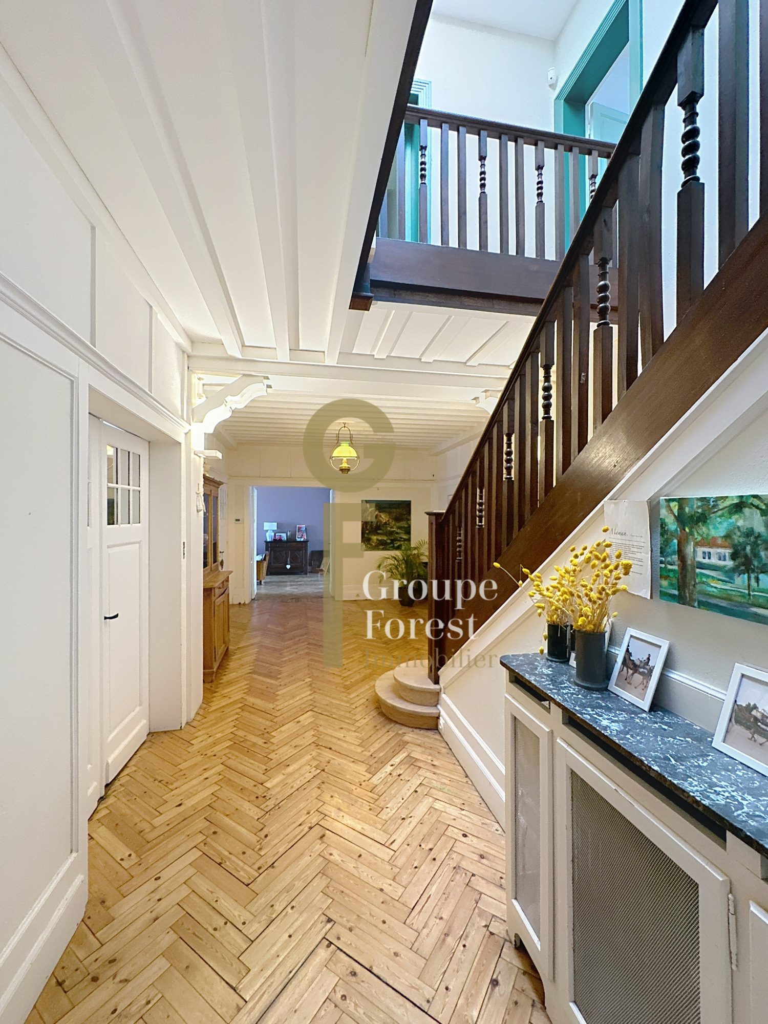 Le premier étage se compose de l'appartement parental avec chambre, dressing Monsieur, dressing Madame, salle de bains complète art-déco avec baignoire et douche, toilettes, de quatre autres chambres et d'une seconde salle de bains complète.