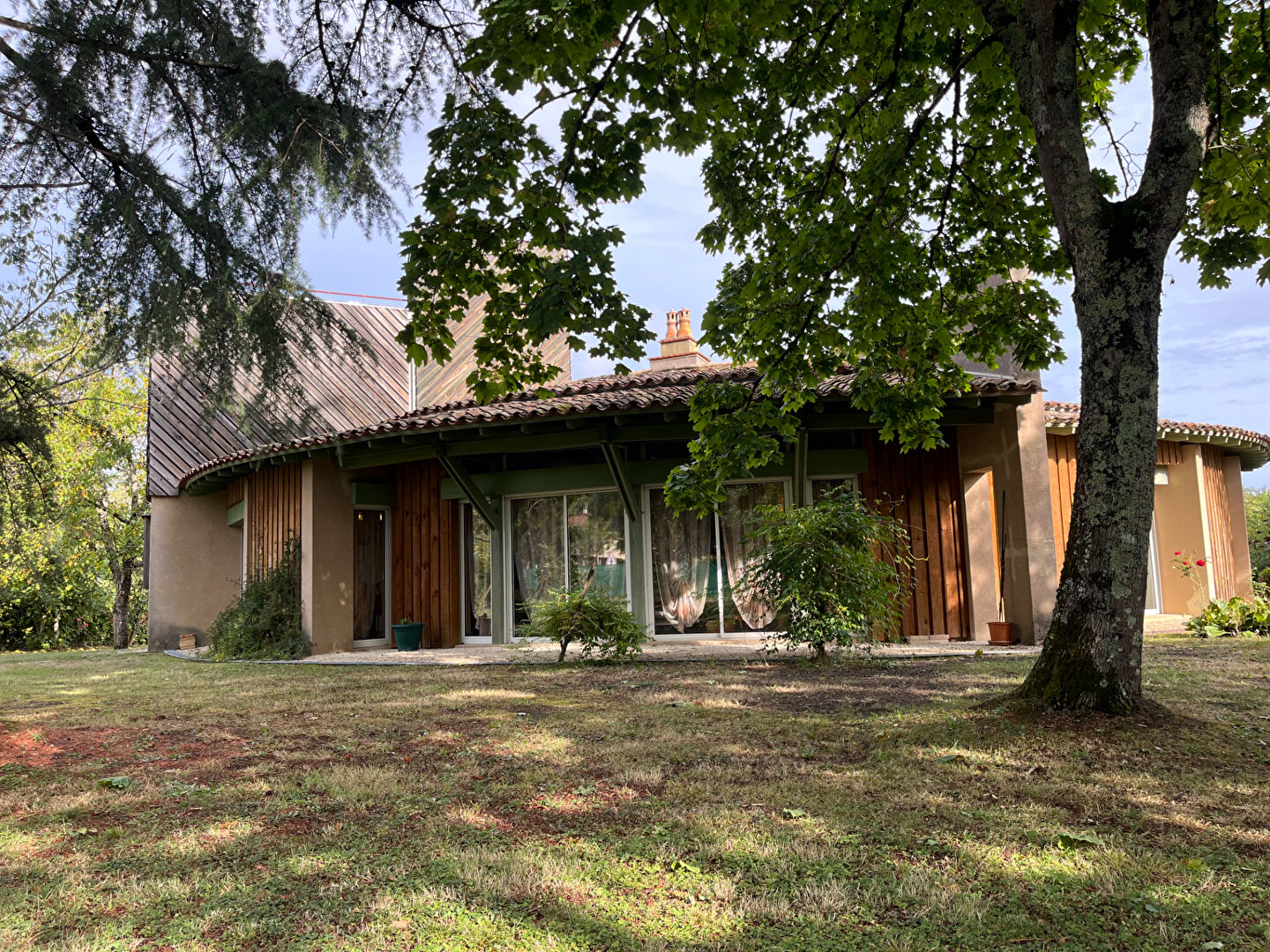 Originale, atypique, contemporaine et lumineuse, cette maison offre un cadre de vie agréable sur un terrain arboré entièrement clos et avec portail électrique et de nombreux arbres fruitiers.