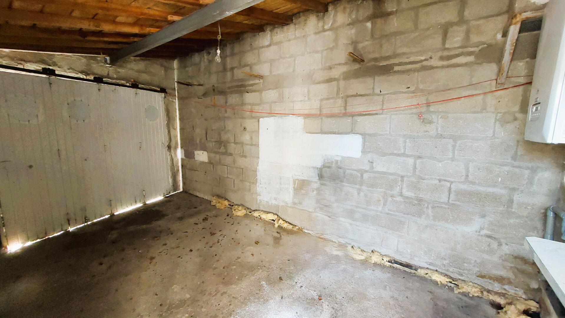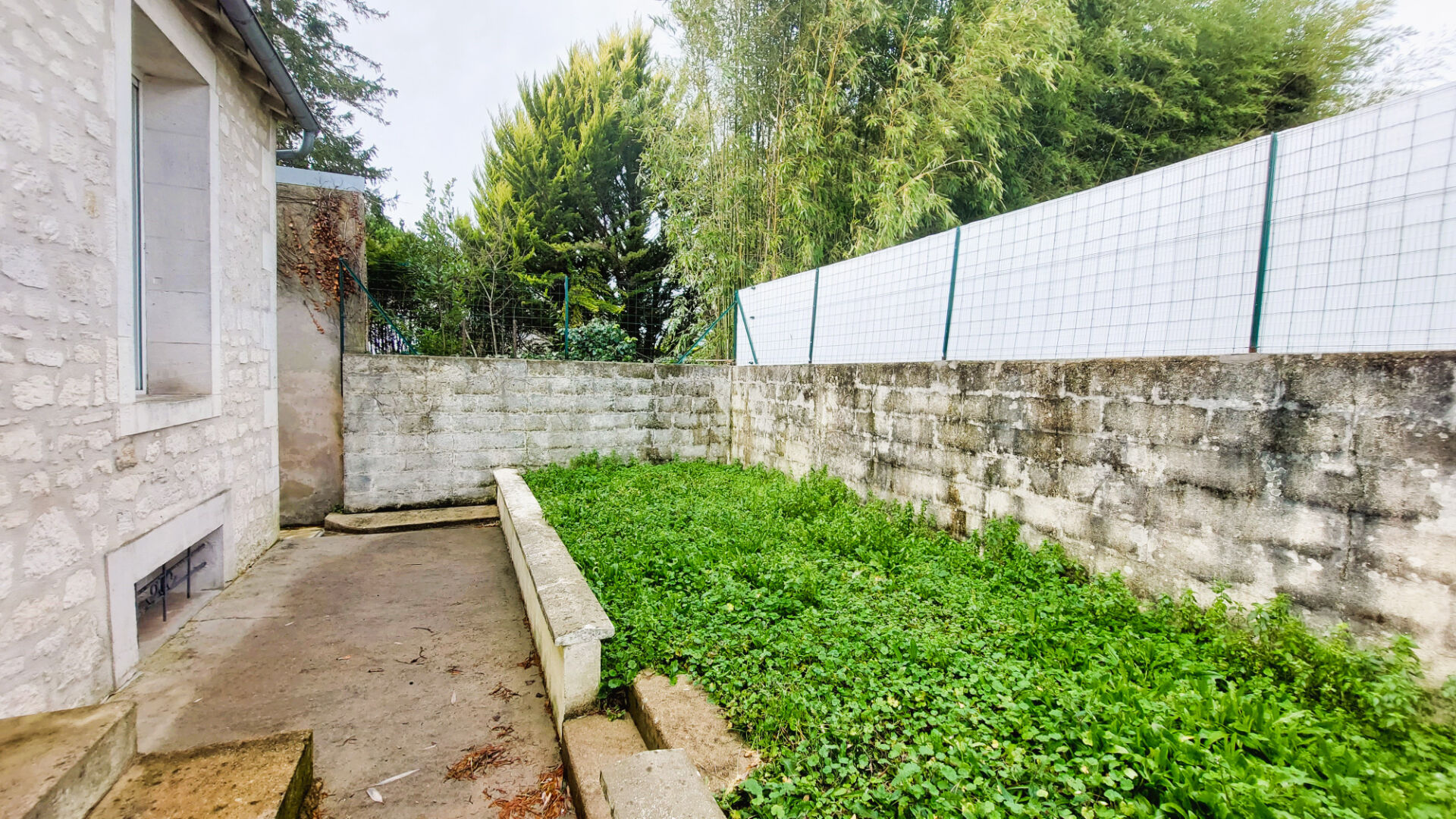Un garage à l'avant et un jardinet clos de murs à l'arrière.
