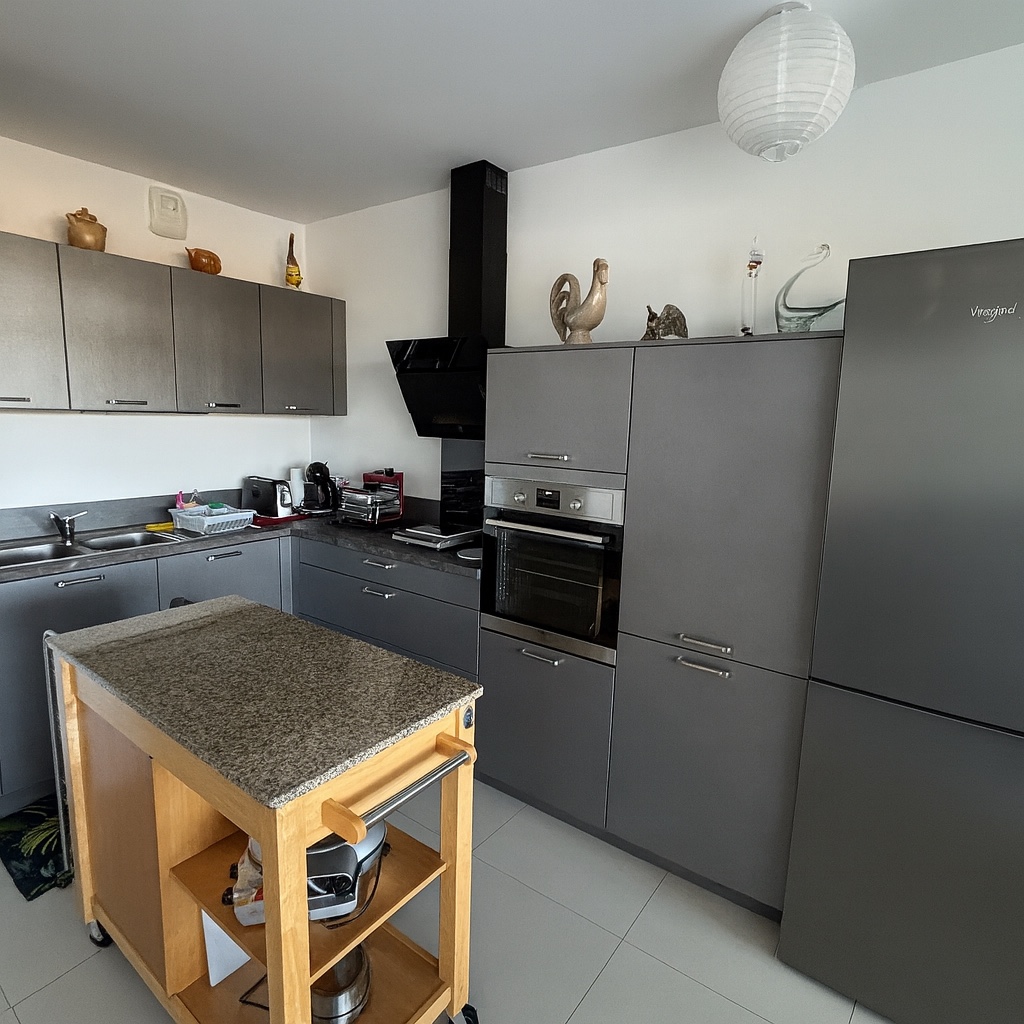 Cet appartement se compose d'une grande pièce de vie de 45m² avec sa cuisine aménagée moderne, deux chambres, une salle d'eau, un cellier et un wc indépendant.