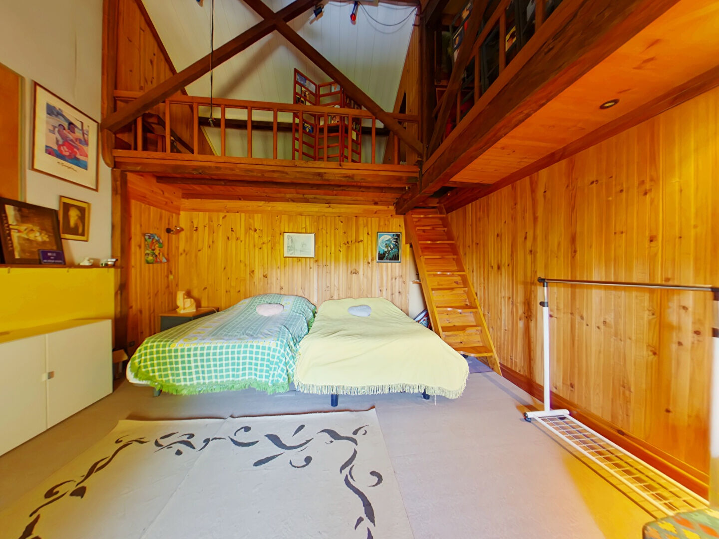 A l'étage: palier, 4 chambres, dont une avec mezzanine, salle de bains avec toilettes.