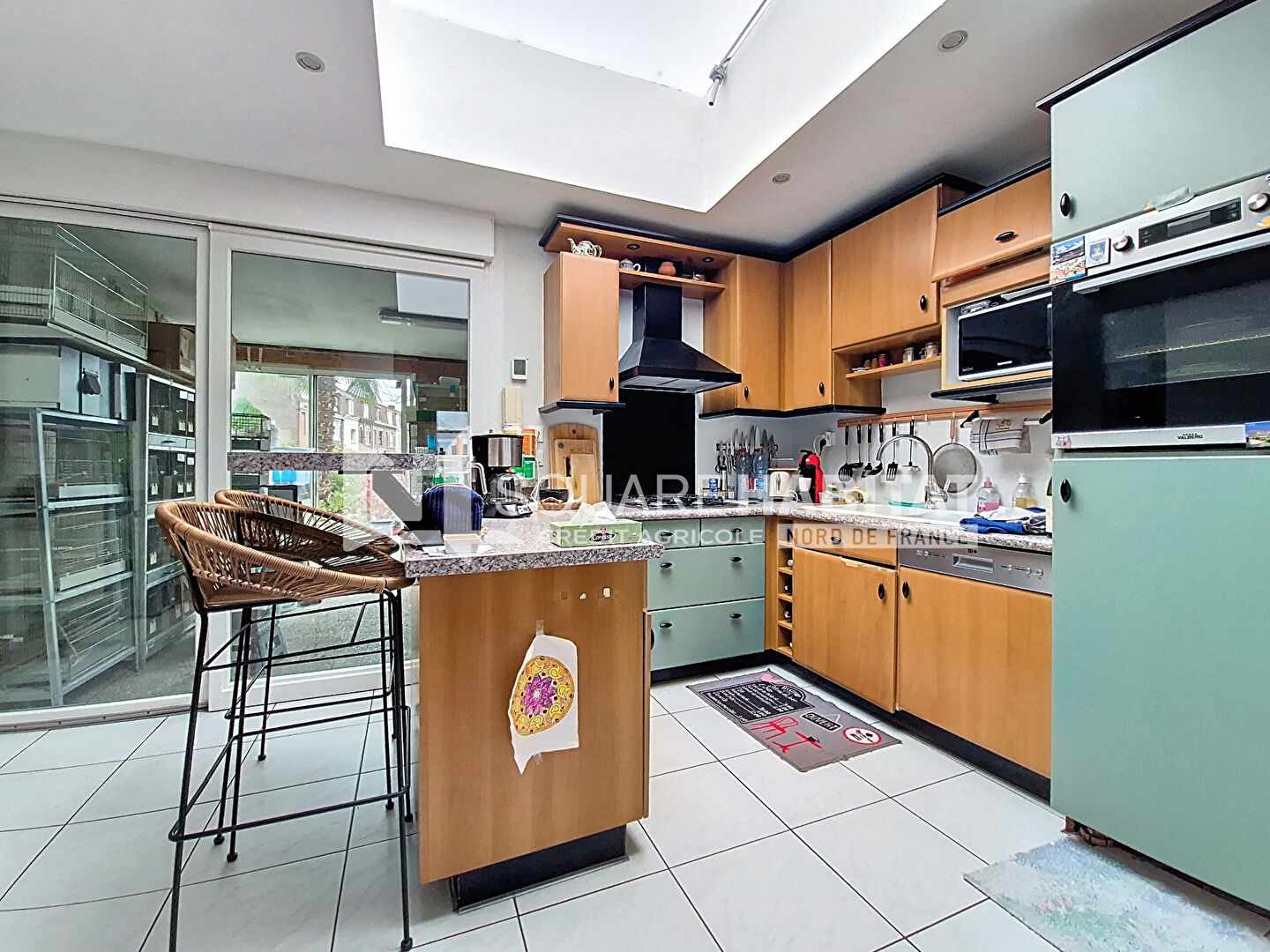 Salon de quasiment 40 m² équipé d'un poêle à bois pour passer vos soirées d'hiver. Un sas d'entrée avec placard. Vous trouverez également une cuisine ouverte donnant sur une véranda.