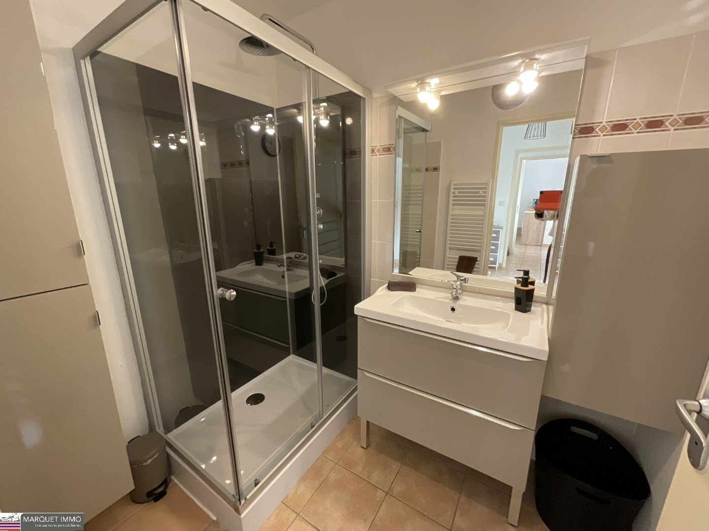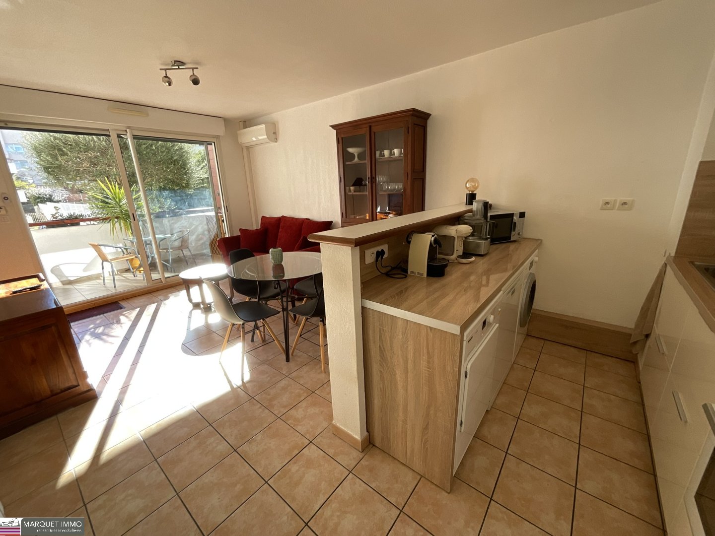 Séjour avec jolie cuisine américaine aménagée de 20 m² donnant sur la terrasse avec vue verdoyante, 2 chambres avec placards et sde aménagée..