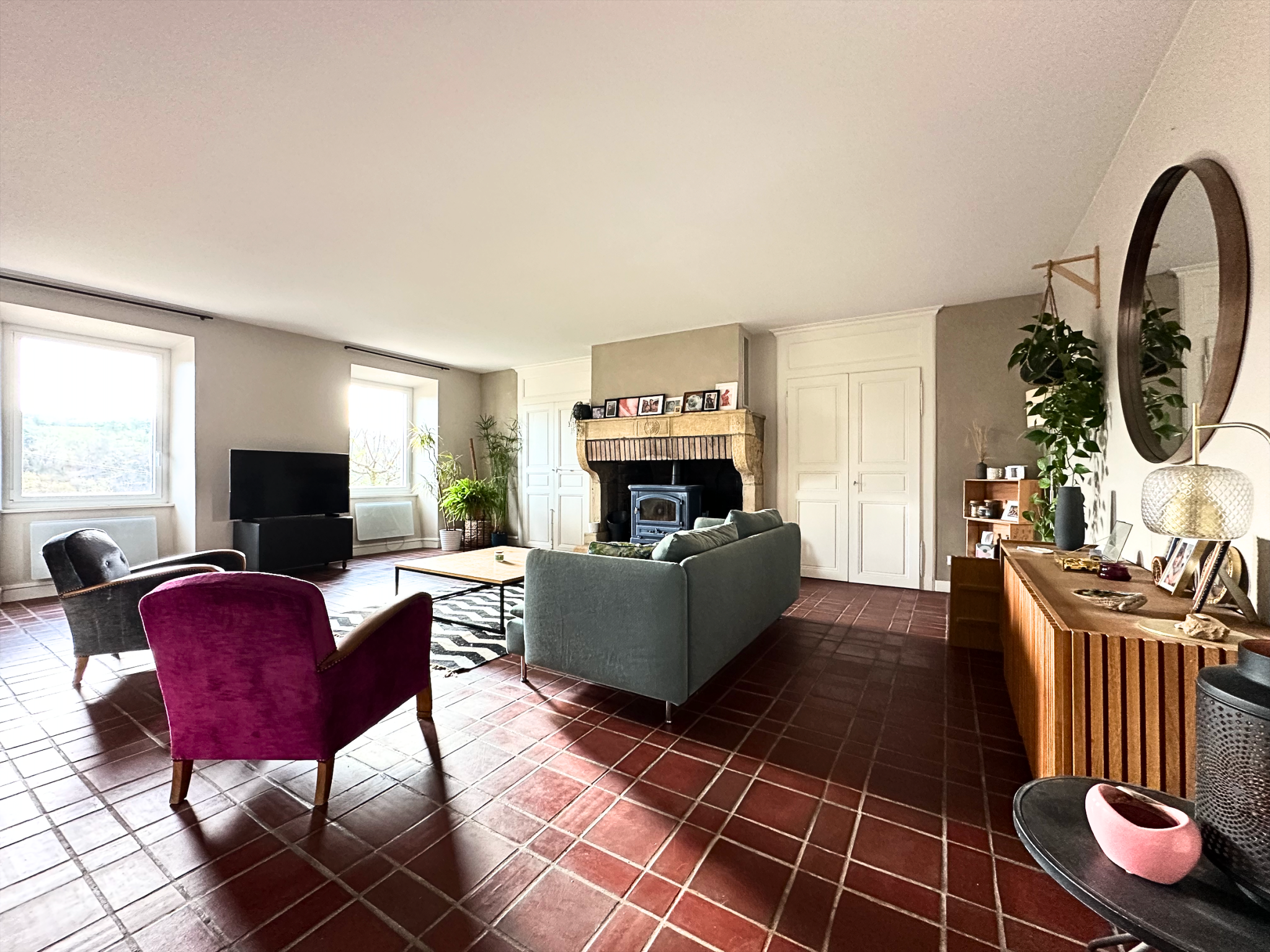 D'autre part, vous bénéficierez d'un imposant espace séjour mettant en valeur un authentique manteau de cheminé en pierre accueillant un poêle traditionnel, menant à un espace bureau, pouvant faire office de 10ème chambre.