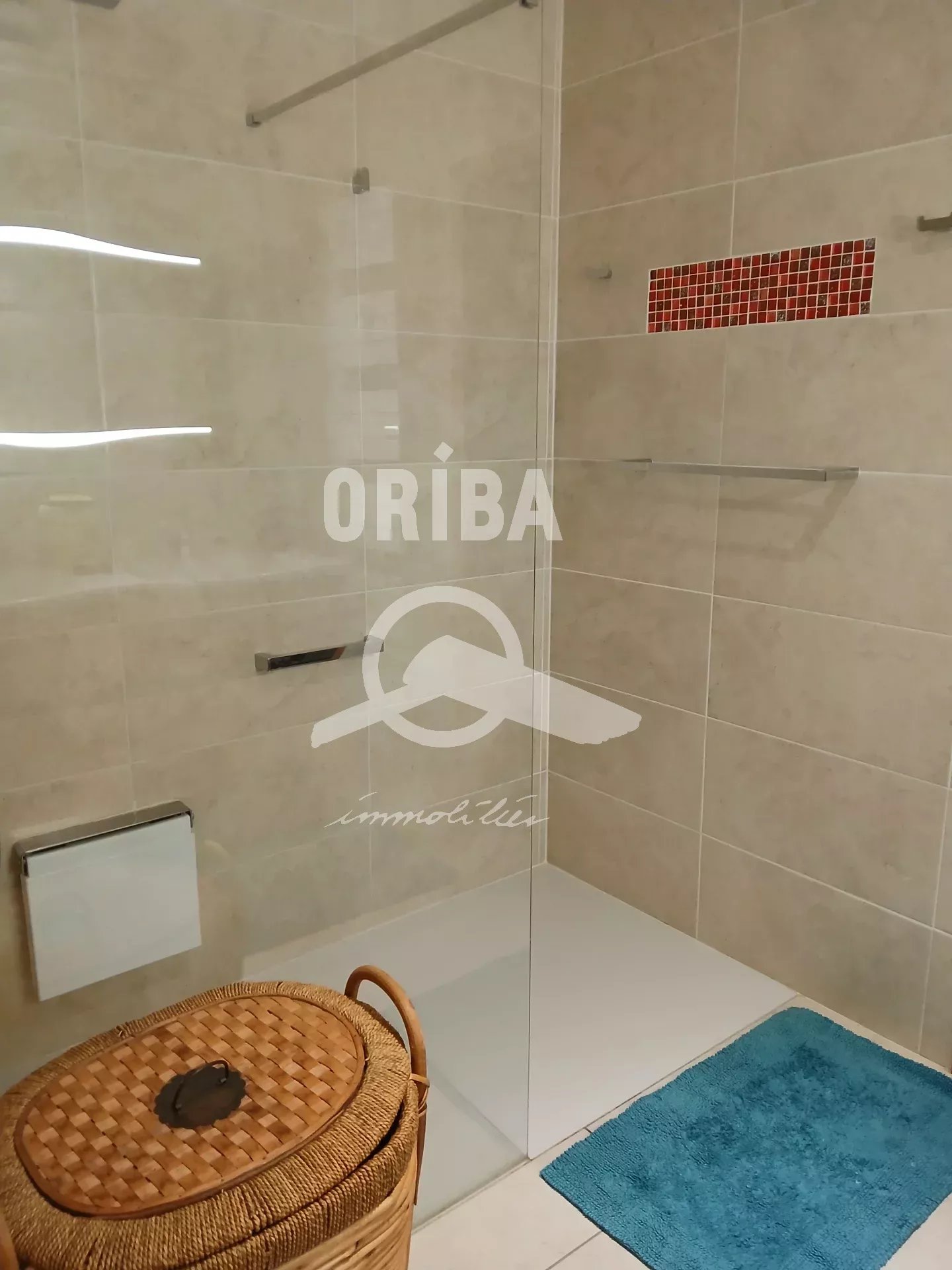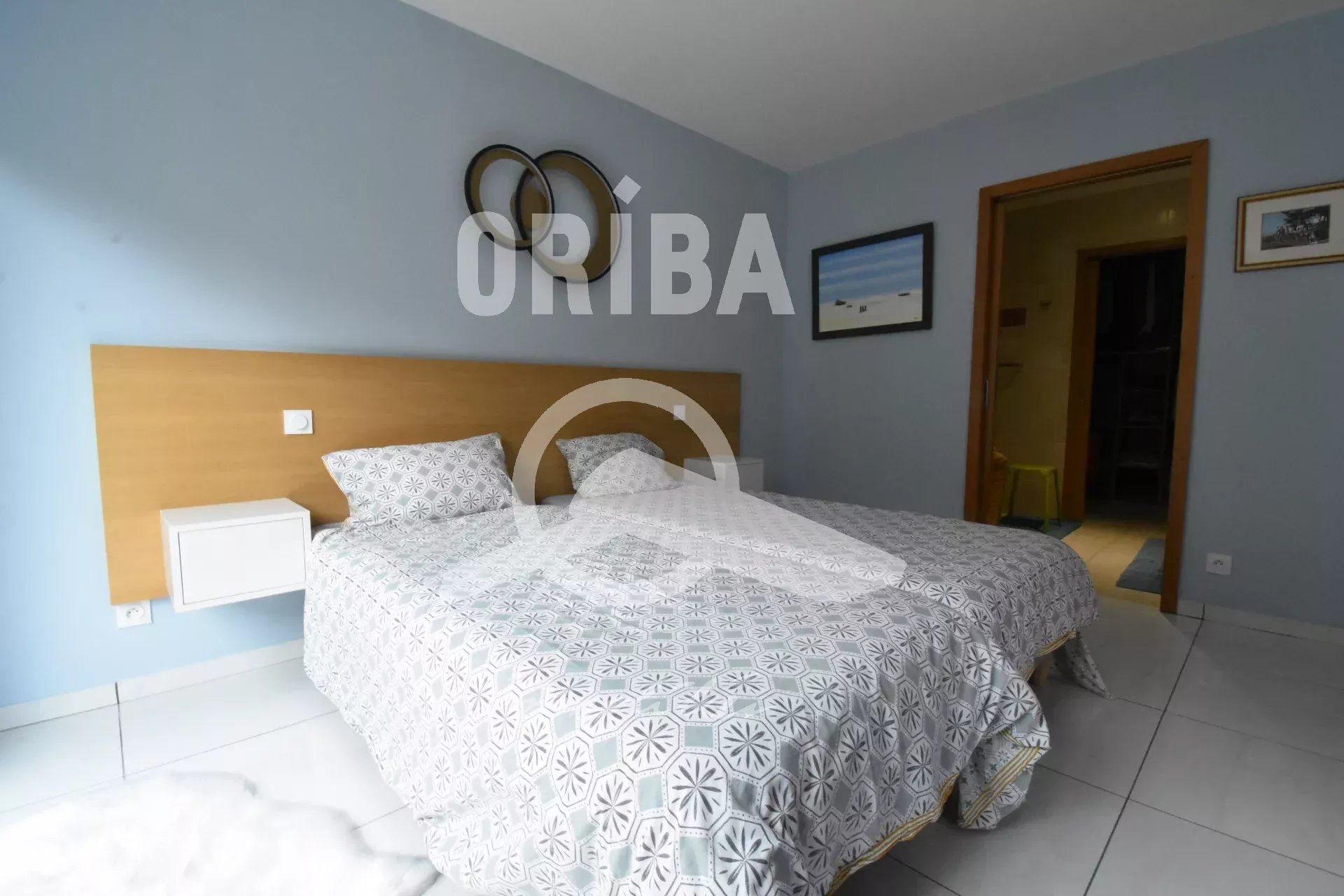 A l'étage : une vaste mezzanine, une chambre avec salle de douche et dressing (sur balcon filant), une salle de bains et une troisième chambre avec dressing.