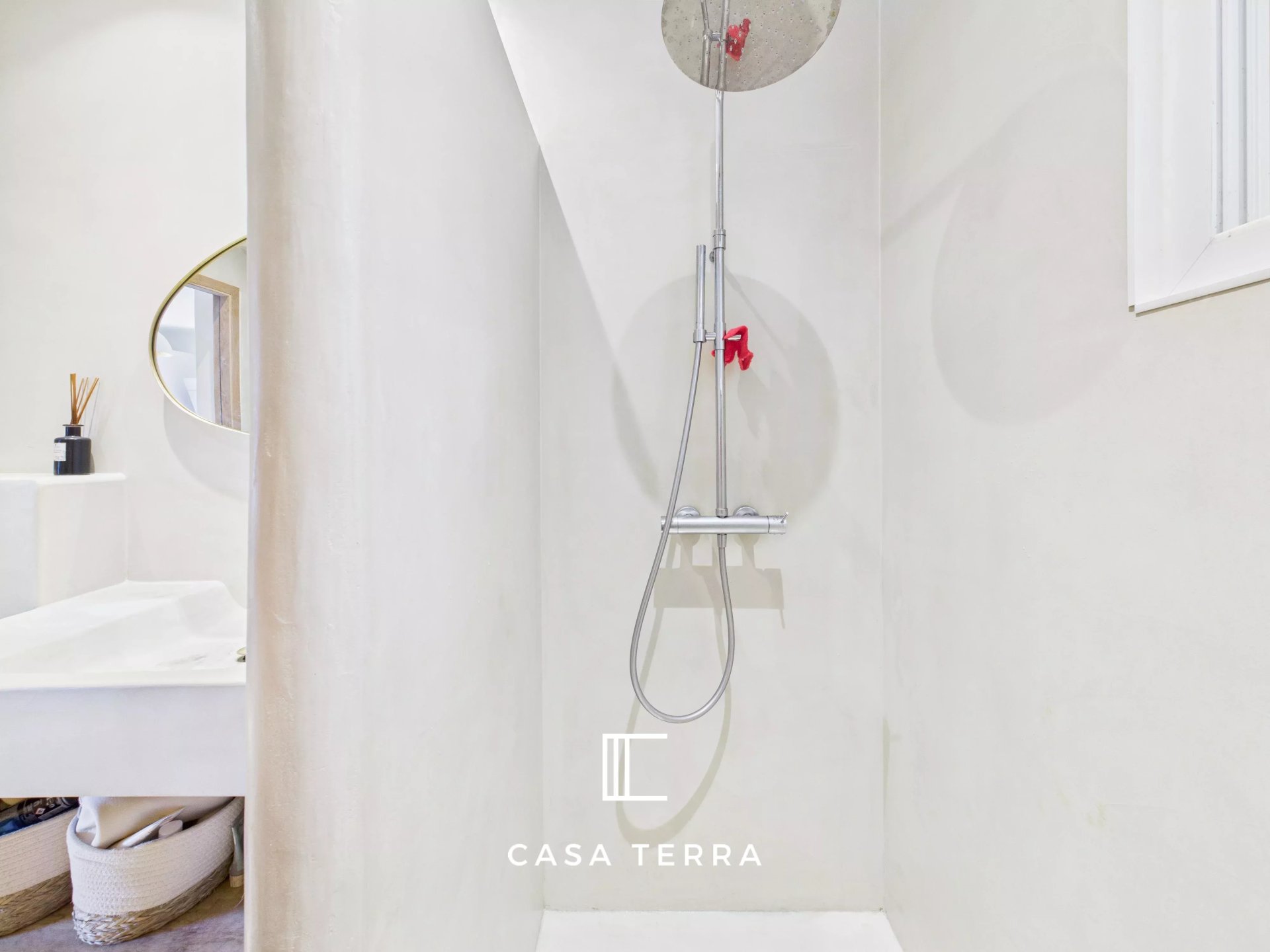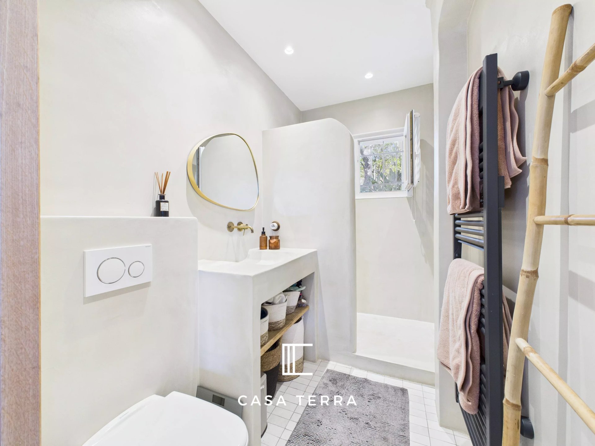 Au même niveau, la villa de type 3, propose une salle de douche moderne en béton ciré avec un toilette suspendu, ainsi que d'une chambre.