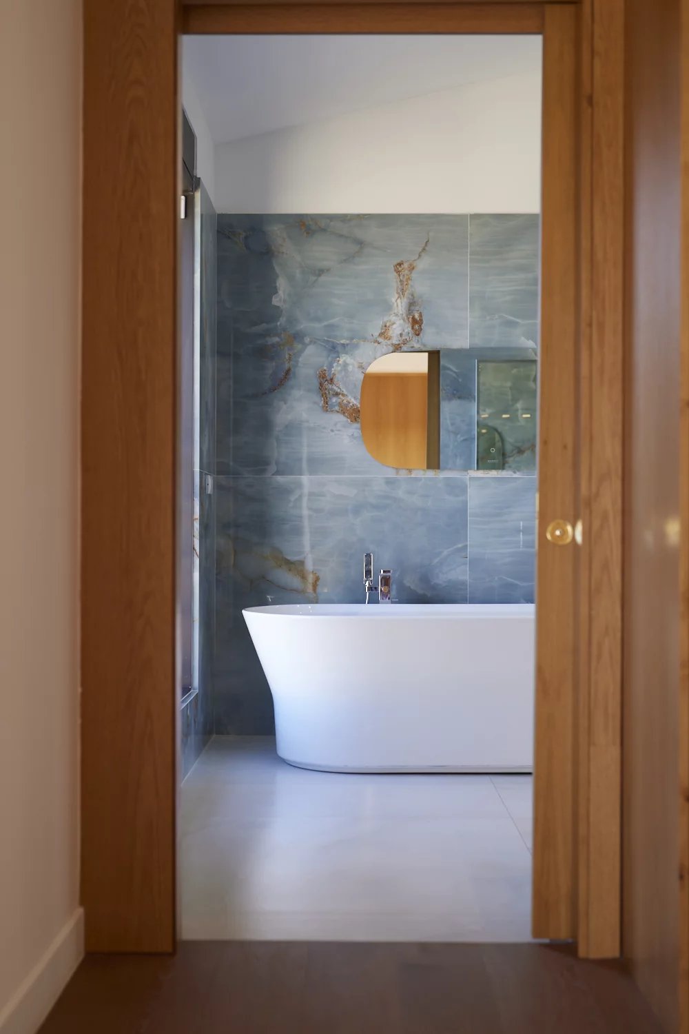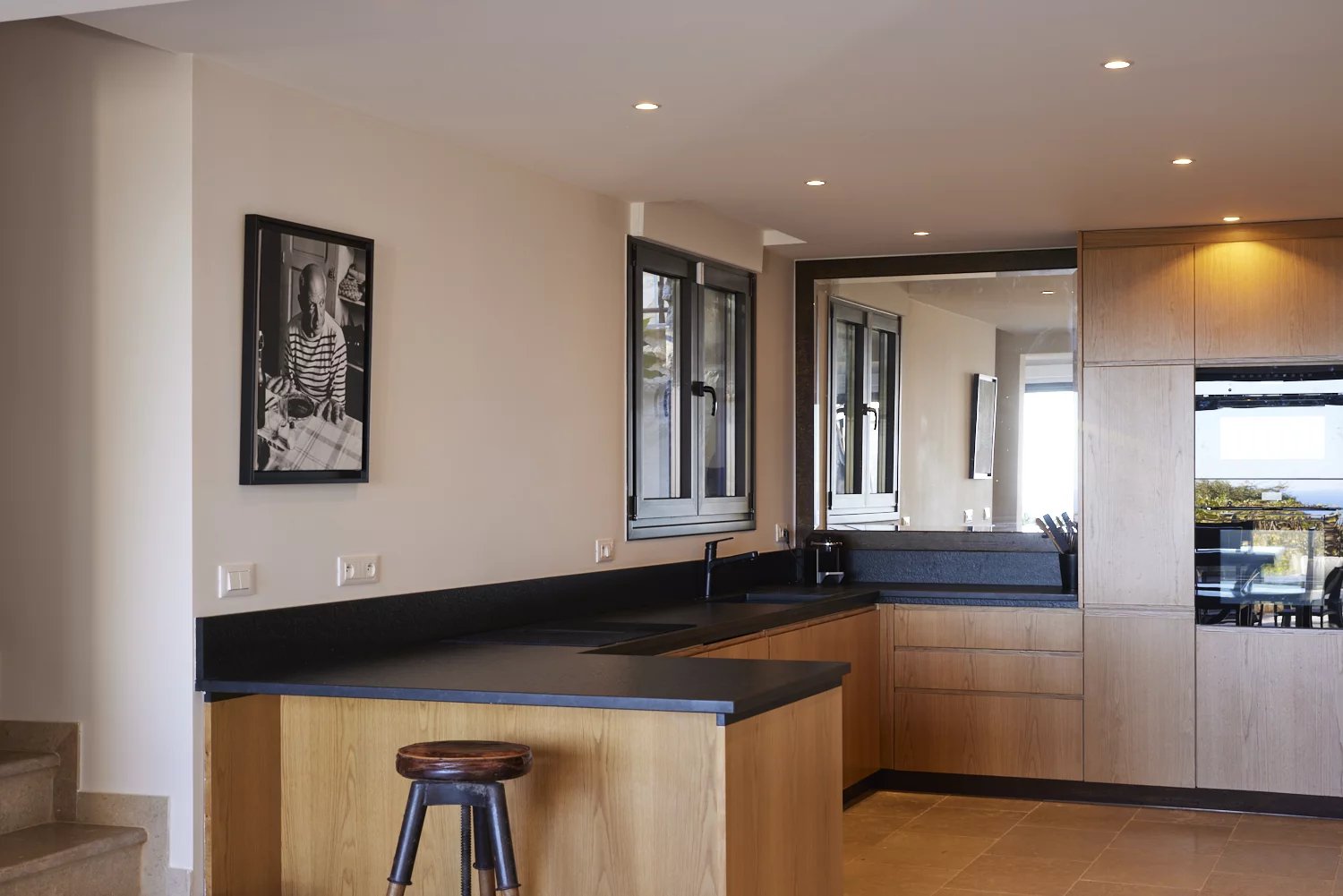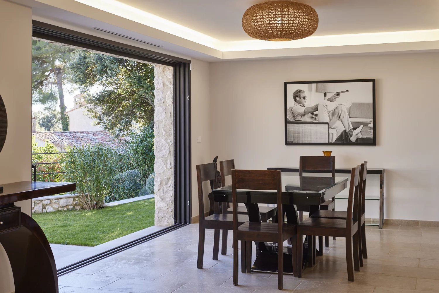 Le rez-de-chaussée accueille un séjour traversant, une salle à manger ouverte sur l’extérieur et une cuisine fonctionnelle avec cellier. Chaque pièce bénéficie de larges baies donnant sur les terrasses et le jardin, créant une vraie continuité dedans/dehors.