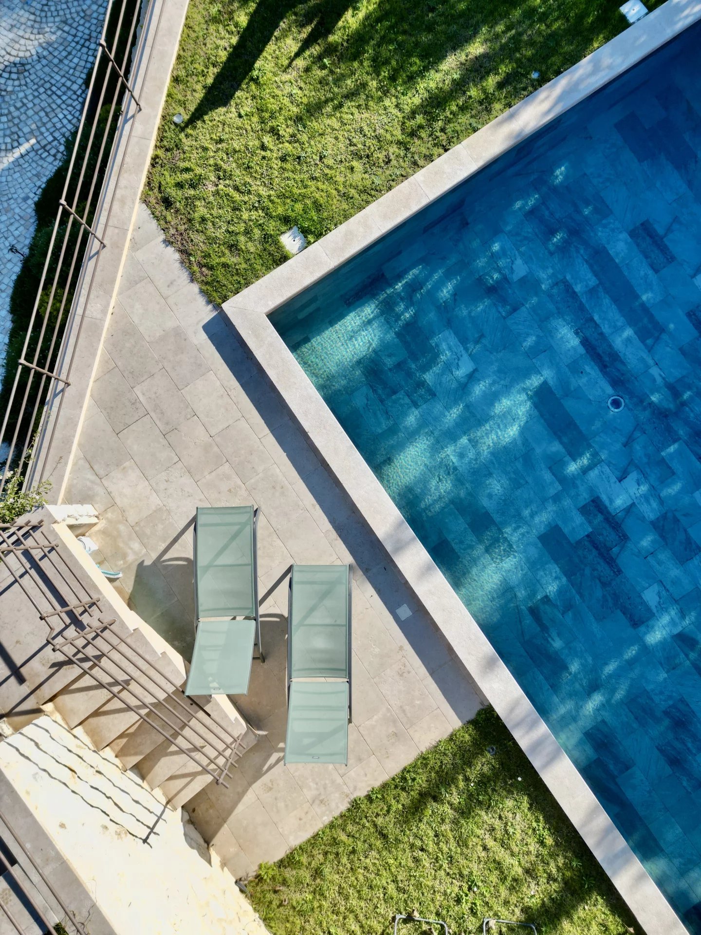 Le terrain de 1 550 m² est aménagé de manière simple et efficace : plusieurs terrasses, des espaces ombragés pour les repas d’été, et une piscine bien intégrée à l’ensemble. L’environnement est paisible et sans vis-à-vis direct.