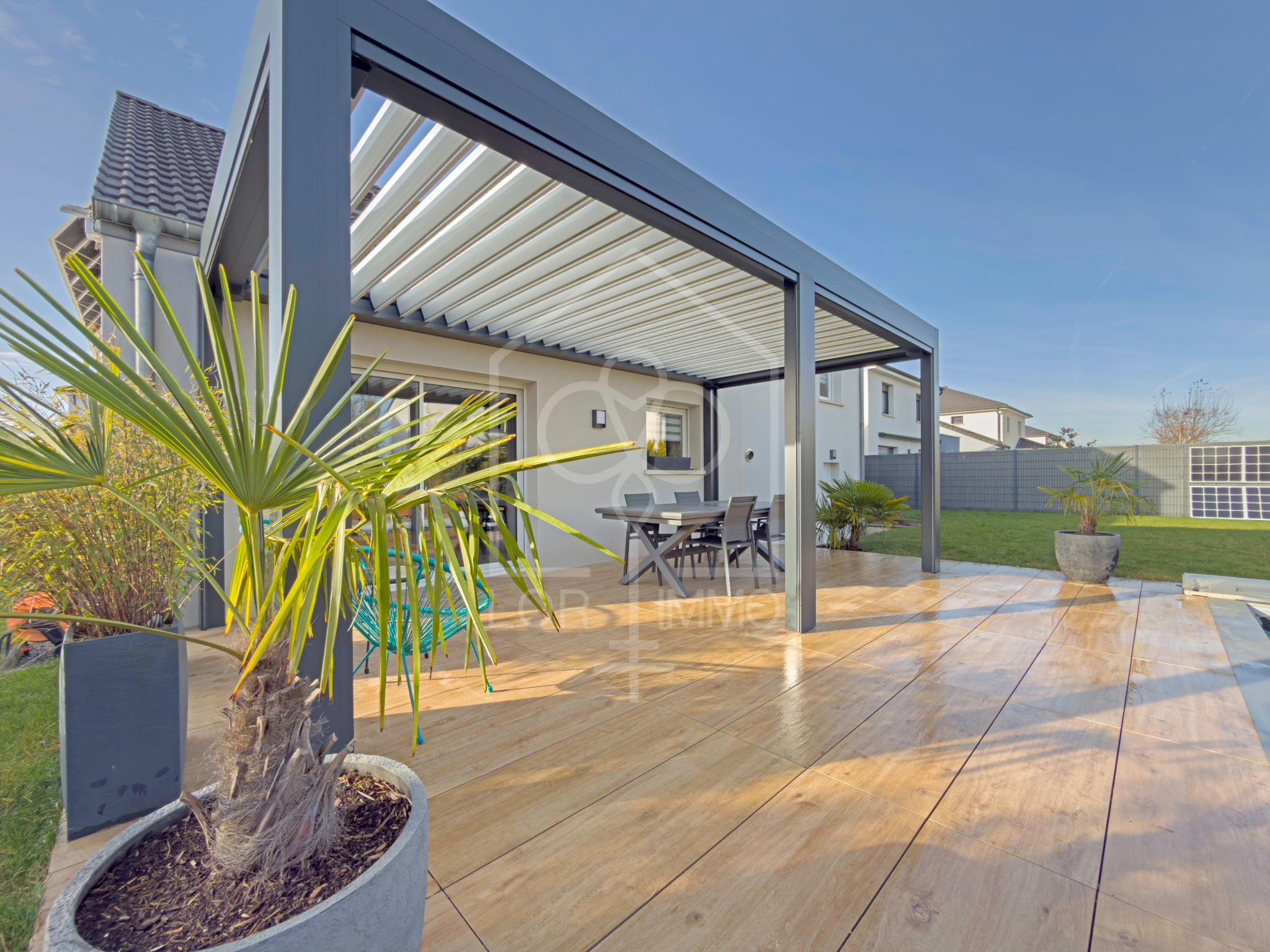 Une terrasse équipée d'une pergola bioclimatique
