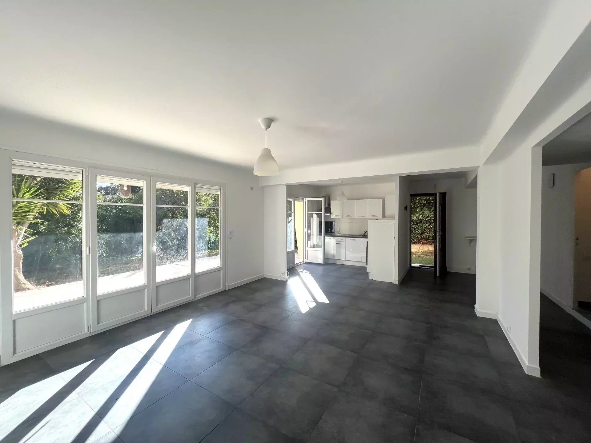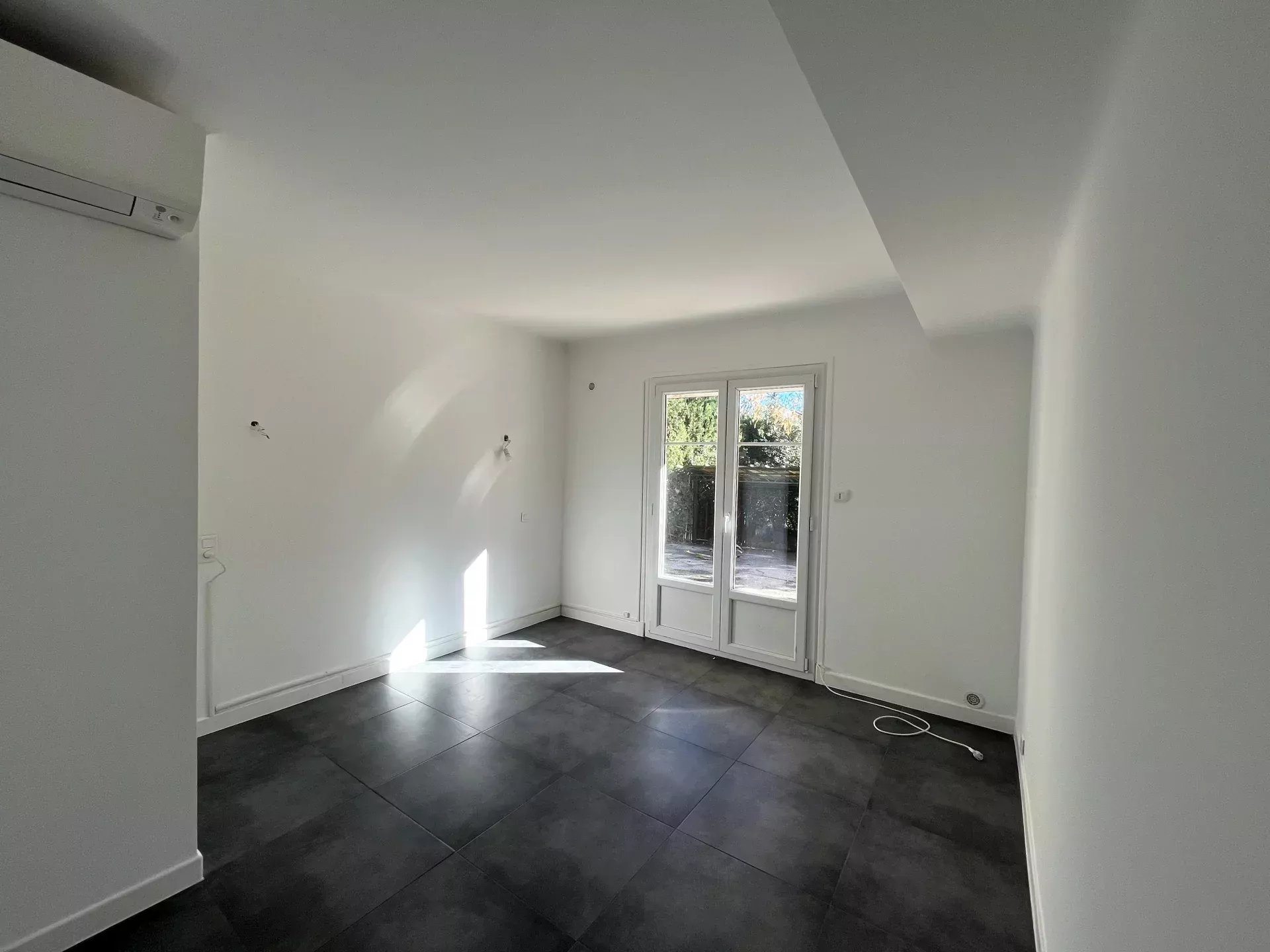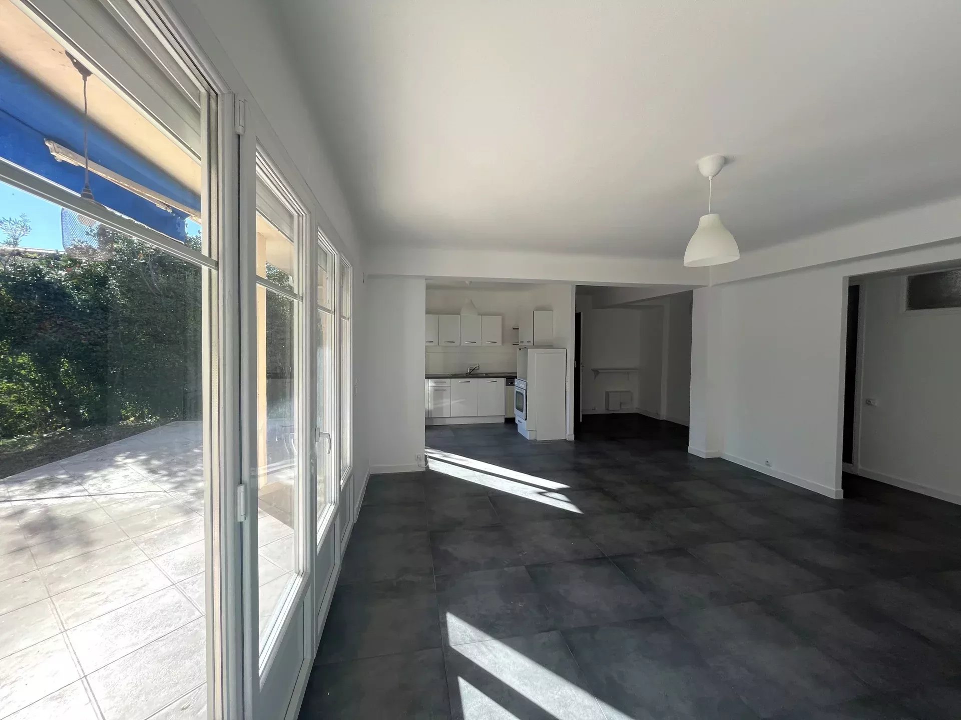 L'appartement est composé d'un vaste séjour avec cuisine ouverte donnant sur une terrasse de 45 m² avec un jardin à jouissance privative d'environ 150m² dans le prolongement. Il dispose d'une chambre, une salle de bains (baignoire et douche), un wc invités et une pièce supplémentaire de 8.52m² sans fenêtre. Cette pièce est reliée à la cave attenante, il pourrait être envisagé d'agrandir la chambre et d'avoir un accès sur l'extérieur.