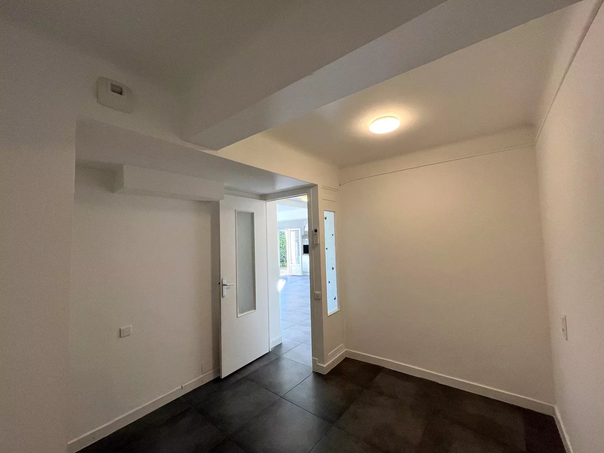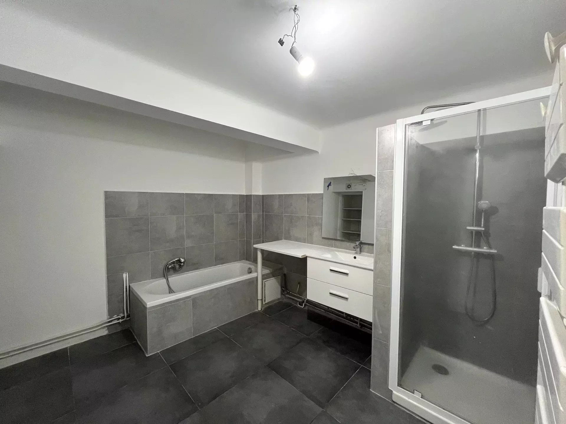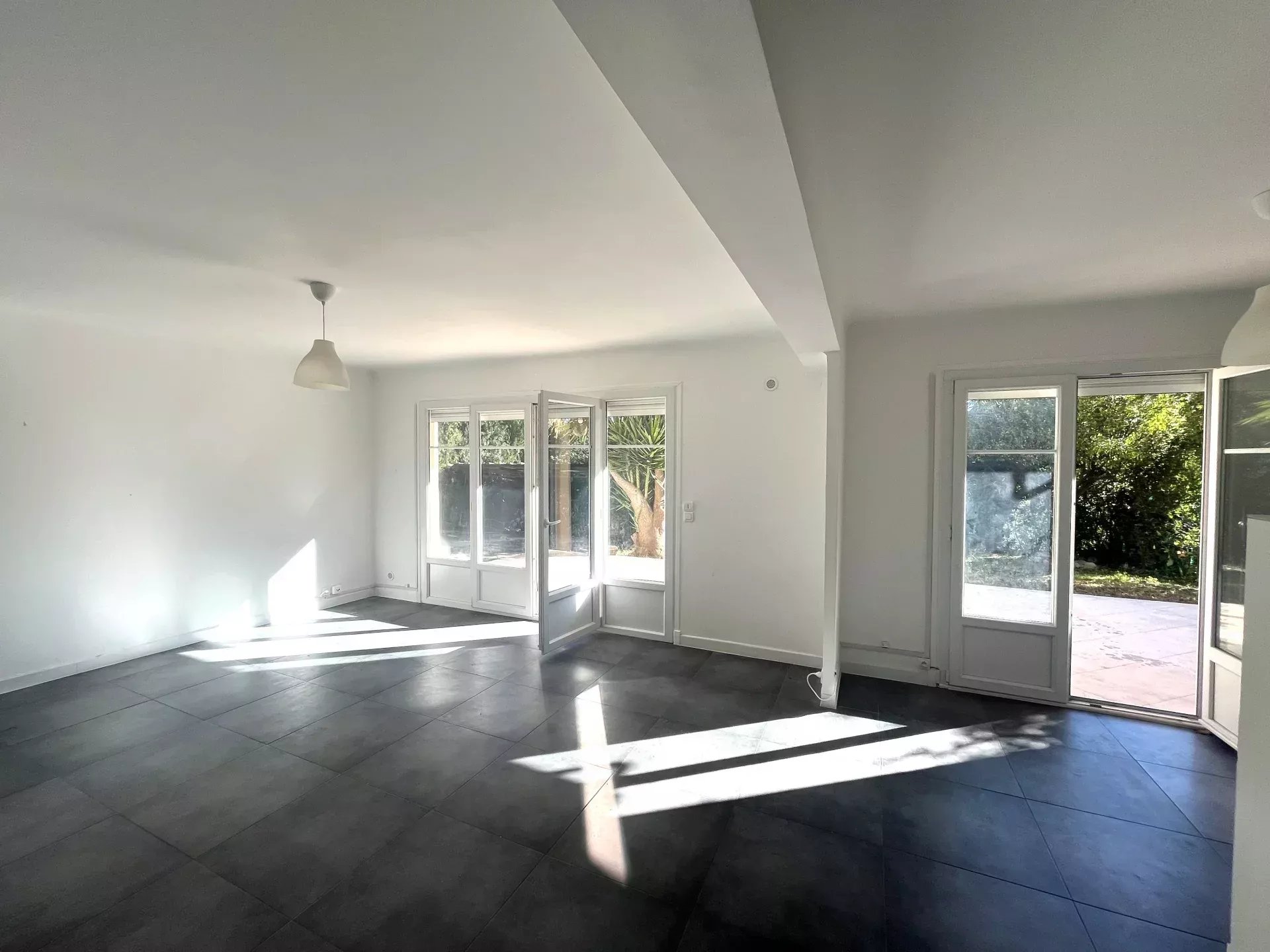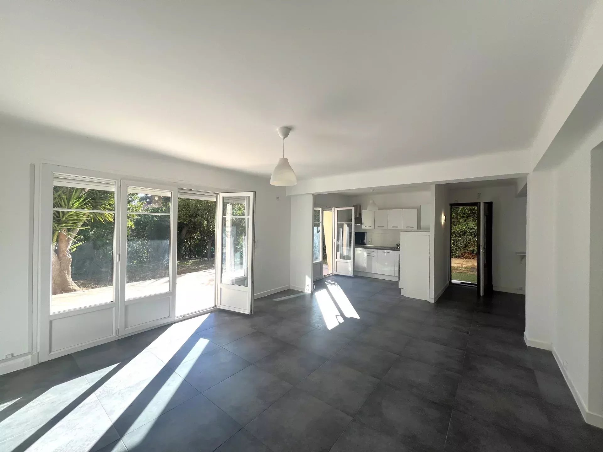L'appartement est composé d'un vaste séjour avec cuisine ouverte donnant sur une terrasse de 45 m² avec un jardin à jouissance privative d'environ 150m² dans le prolongement. Il dispose d'une chambre, une salle de bains (baignoire et douche), un wc invités et une pièce supplémentaire de 8.52m² sans fenêtre. Cette pièce est reliée à la cave attenante, il pourrait être envisagé d'agrandir la chambre et d'avoir un accès sur l'extérieur.