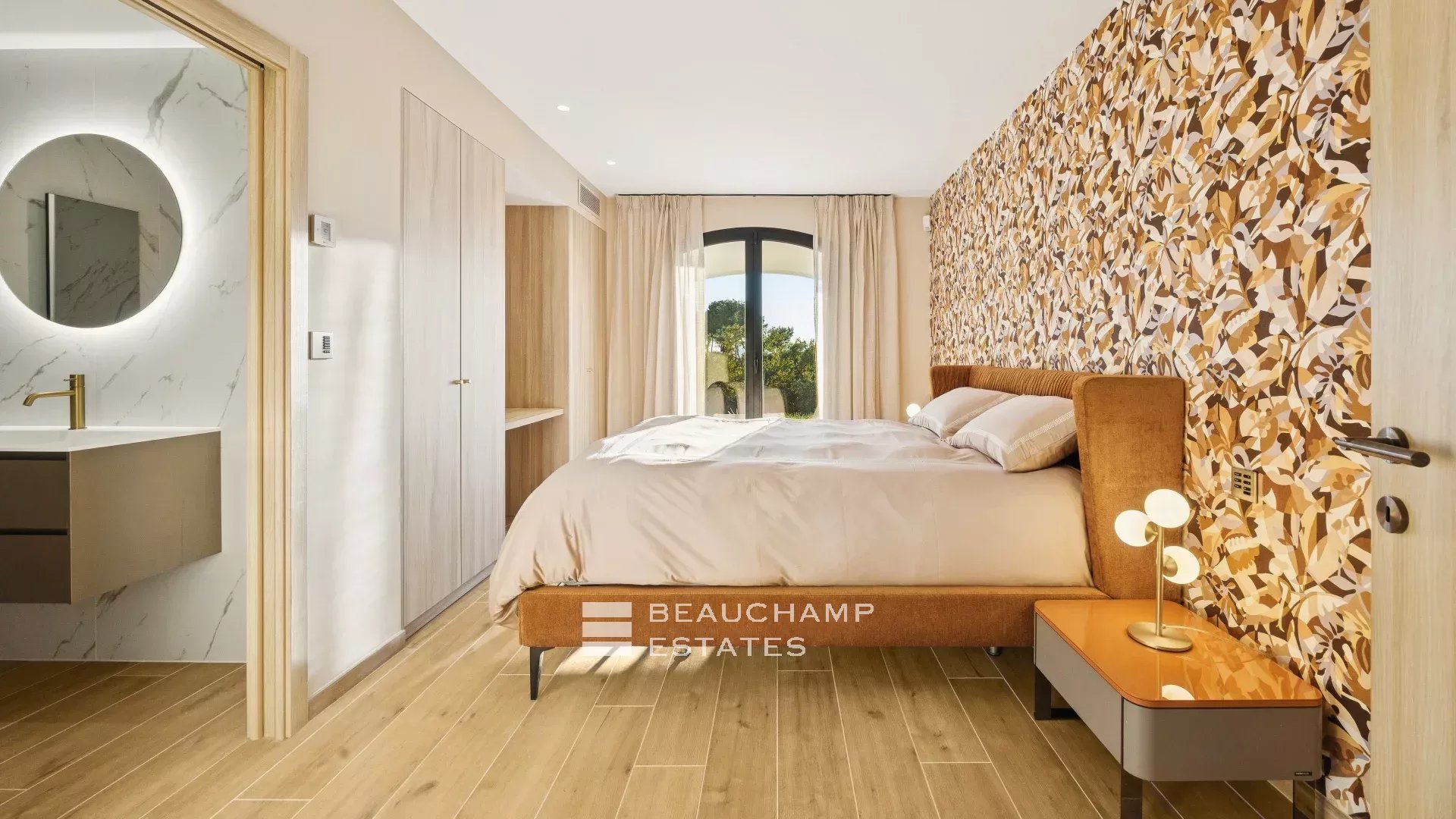 Au niveau jardin, se trouvent quatre chambres en suite ainsi qu’une buanderie. Une grande pièce d’environ 40 m² avec accès indépendant peut être aménagée en salle de sport et un sauna complète cet espace. Le jardin soigneusement entretenu comprend également un jeu de boules et une piscine.