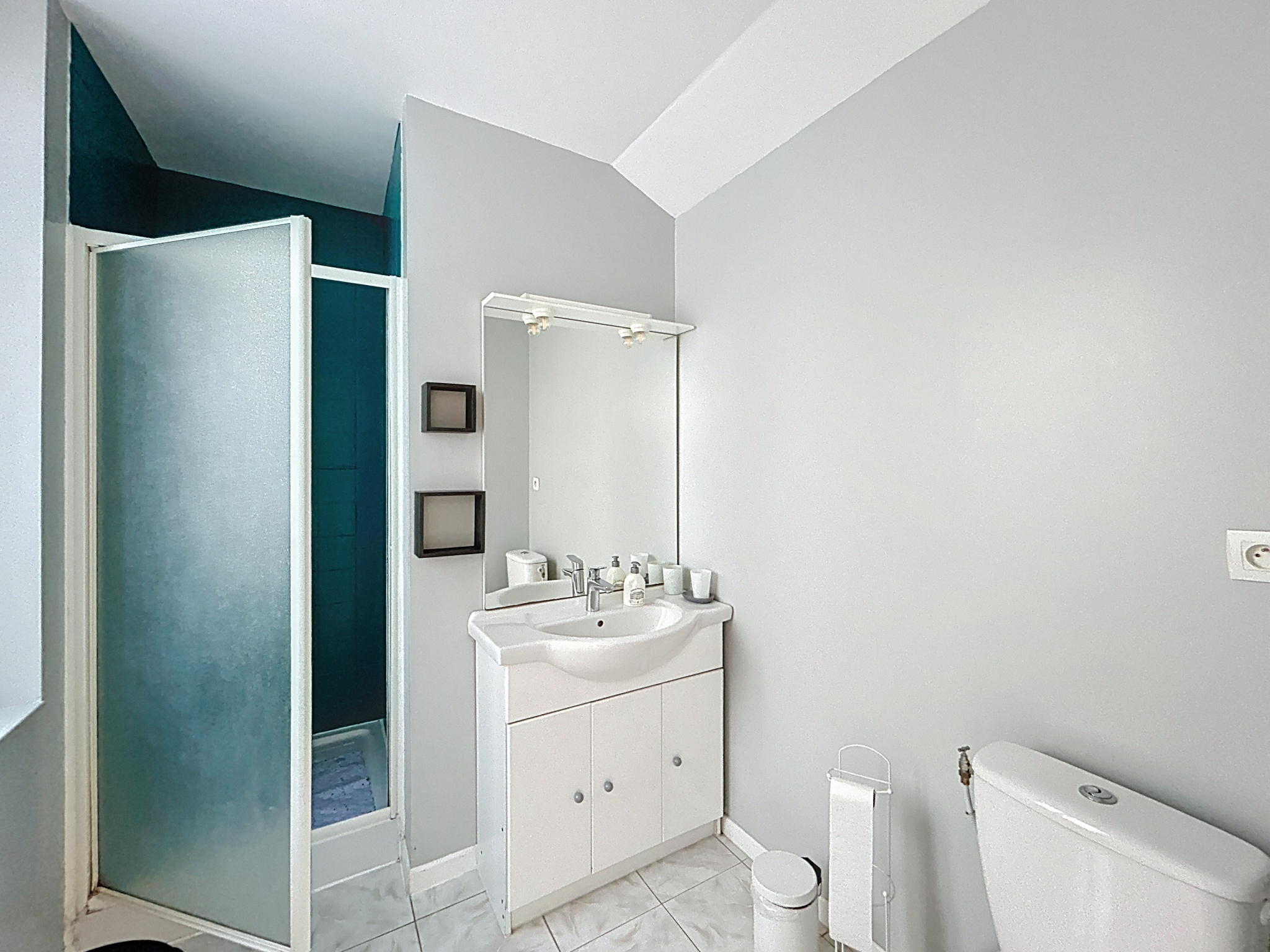 LOGEMENT 3 : Au dernier étage, une pièce de vie cosy avec un coin cuisine, une chambre et une salle d'eau avec WC. Idéal pour un couple ou une personne seule, ce dernier niveau offre une belle vue sur Grandcamp et une belle luminosité.