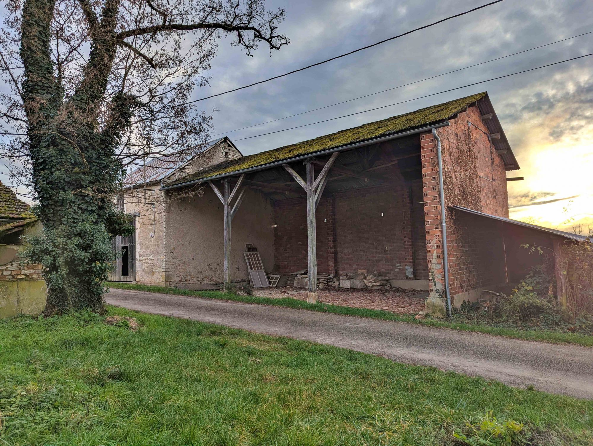 Et de l'autre côté de la rue une grange, un grand appentis et un jardin.