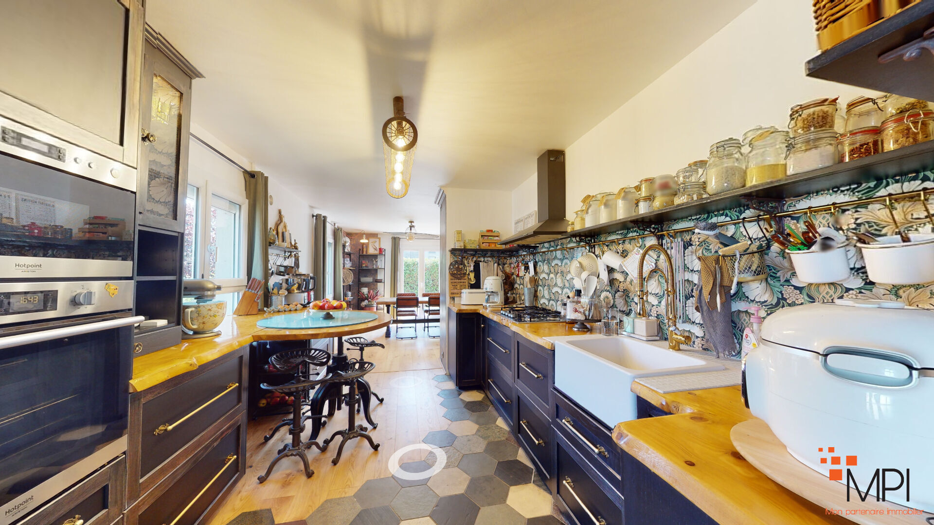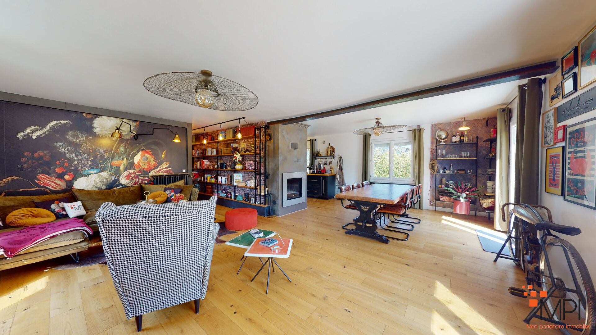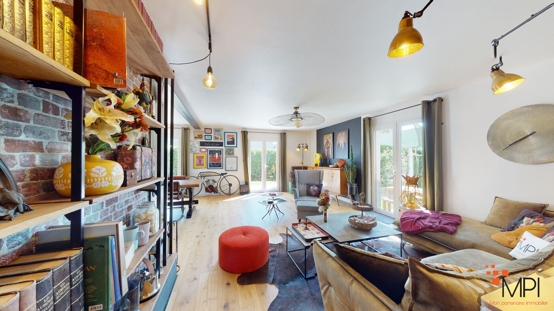 Cette maison, entièrement rénovée avec goût, séduit par ses très beaux volumes et son atmosphère chaleureuse. Dès l'entrée, vous découvrirez un hall indépendant doté de rangements, menant à une spacieuse pièce de vie baignée de lumière grâce à sa triple exposition Est/Sud/Ouest. La cuisine récente, aménagée et entièrement équipée, complète harmonieusement cet espace convivial.