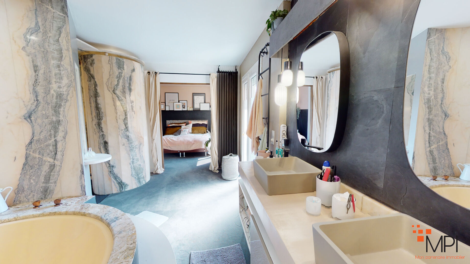 Le rez-de-chaussée offre également deux belles chambres, chacune disposant de sa salle d'eau privative. L'une d'elles bénéficie d'un salon indépendant avec entrée séparée, idéal pour une activité professionnelle ou une location type Air'BNB. Une buanderie, de nombreux espaces de rangement ainsi que des toilettes complètent ce niveau.