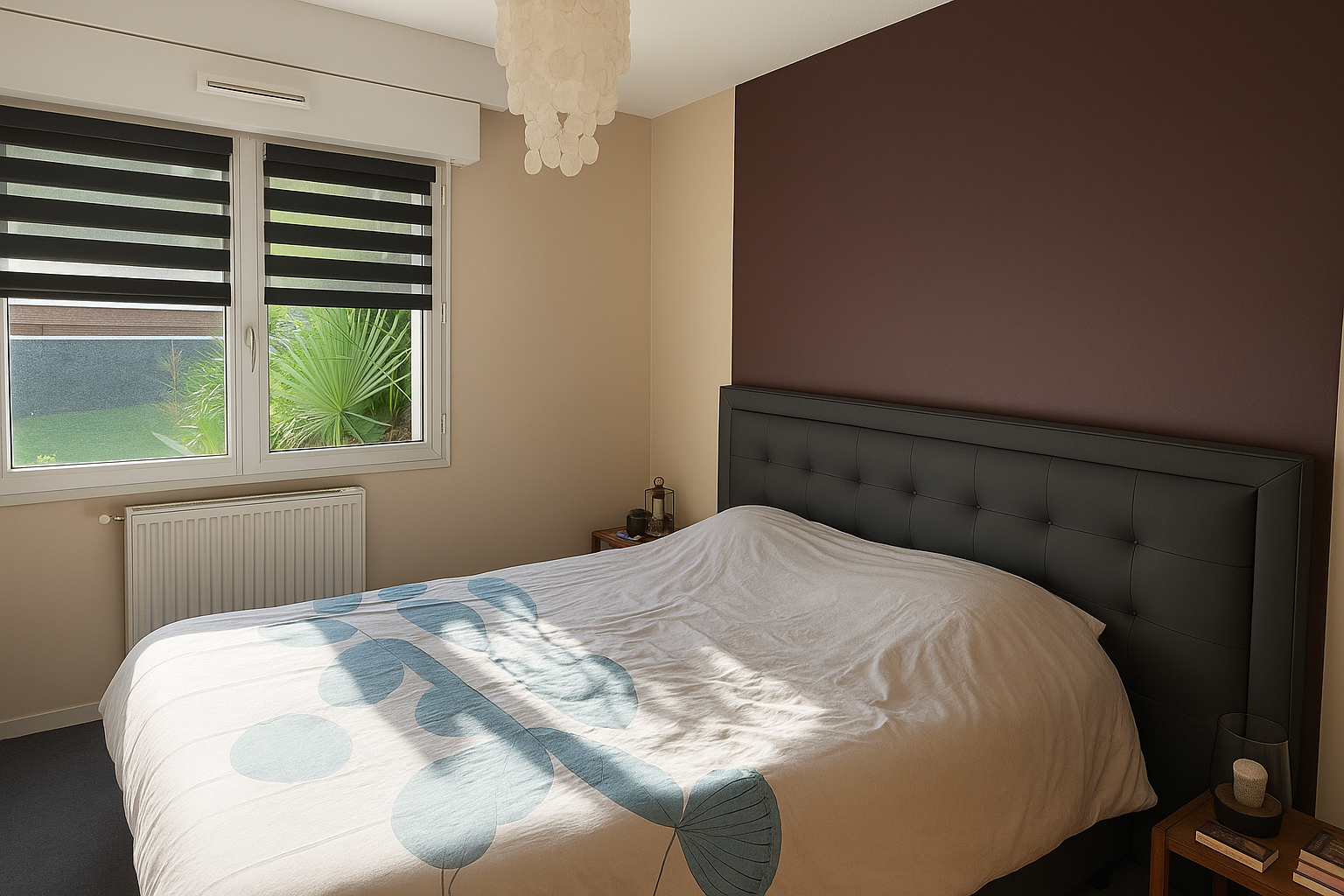 L'entrée dessert un placard fonctionnel avant de s'ouvrir sur un salon-séjour lumineux, exposé sud-ouest, offrant une continuité naturelle vers la terrasse et le jardin. La cuisine aménagée et équipée s'intègre parfaitement à cet espace convivial.