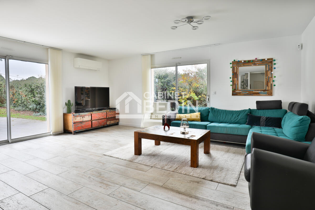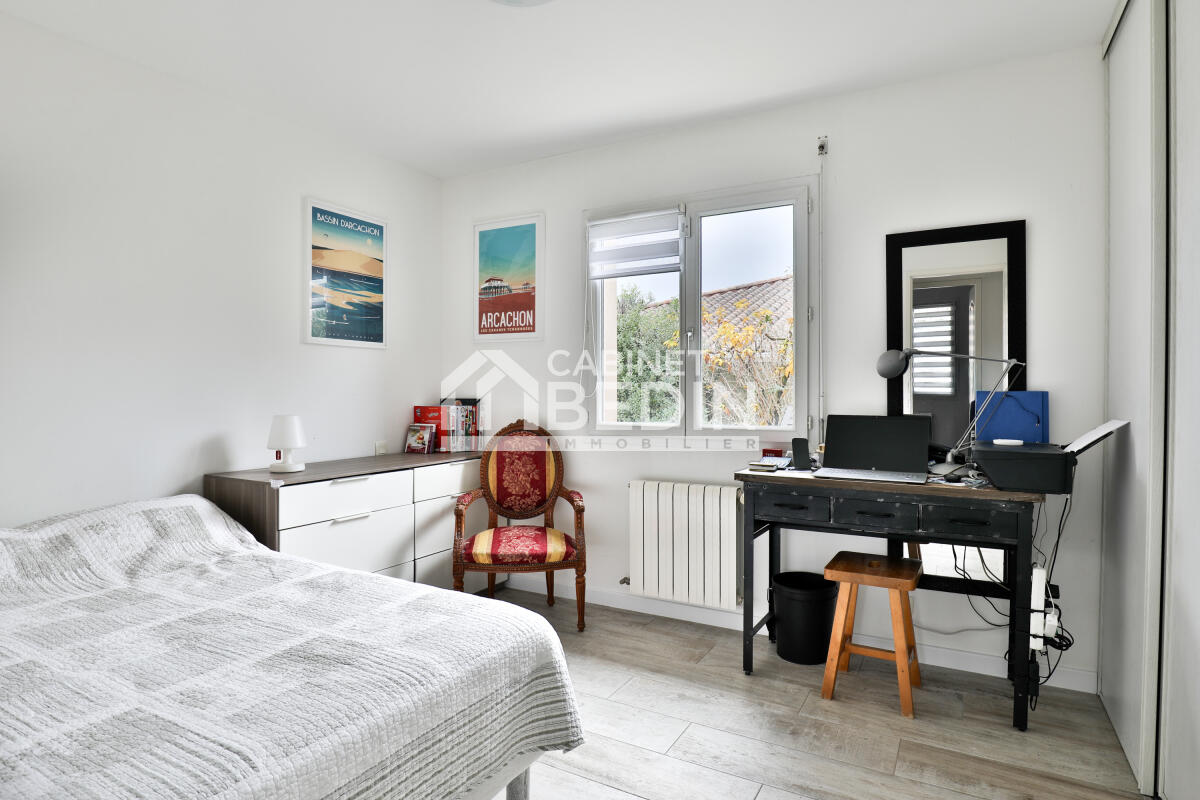 GUJAN-MESTRAS. Nouveau à la vente en exclusivité ! Dans un quartier résidentiel et proche de toutes les commodités, venez découvrir cette maison contemporaine lumineuse de plain pied. Elle offre une spacieuse pièce de vie avec poêle à bois et climatisation réversible, cuisine US équipée et cellier. Le tout avec un accès direct sur le jardin clos et paysager de plus de 800m² avec piscine 8x4 chauffée et terrasse carrelée avec pergola. Côté nuit, vous trouverez quatre chambres dont trois avec placard, une salle de bains et une salle d'eau rénovées. Garage attenant à la maison, stationnement extérieur et chalet en bois complètent le bien. Contactez nous pour une visite privée !