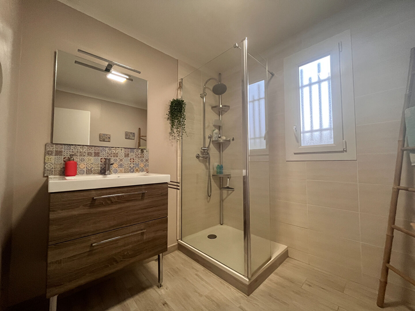 Une salle d'eau avec douche italienne, 3 chambres, un garage, un stationnement facile, un jardin clos et arboré avec un puits. il ne manque rien !