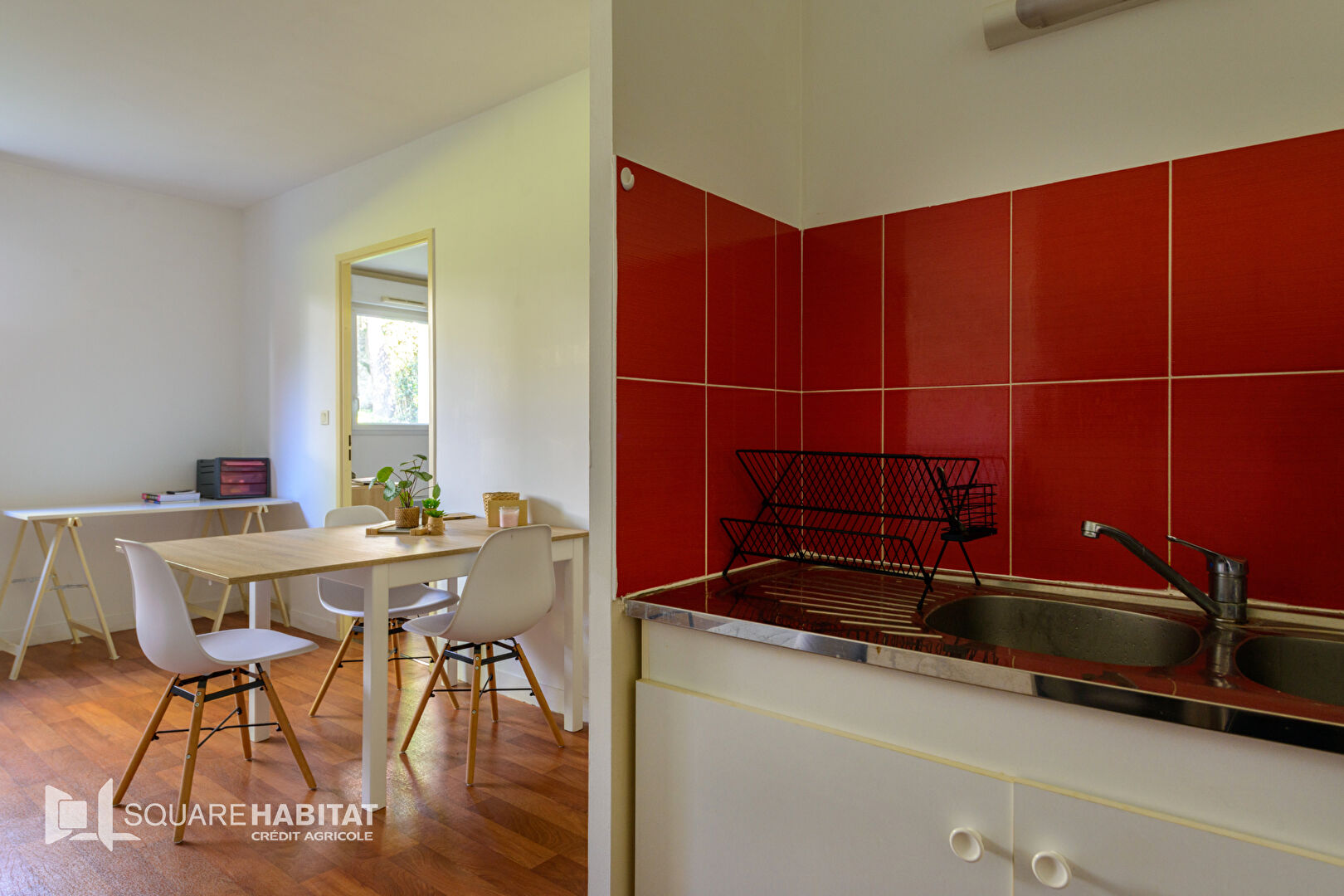 Entrée, séjour avec vue sur le jardin de la copropriété, cuisine ouverte, chambre séparée avec placard, salle d'eau, WC indépendants.