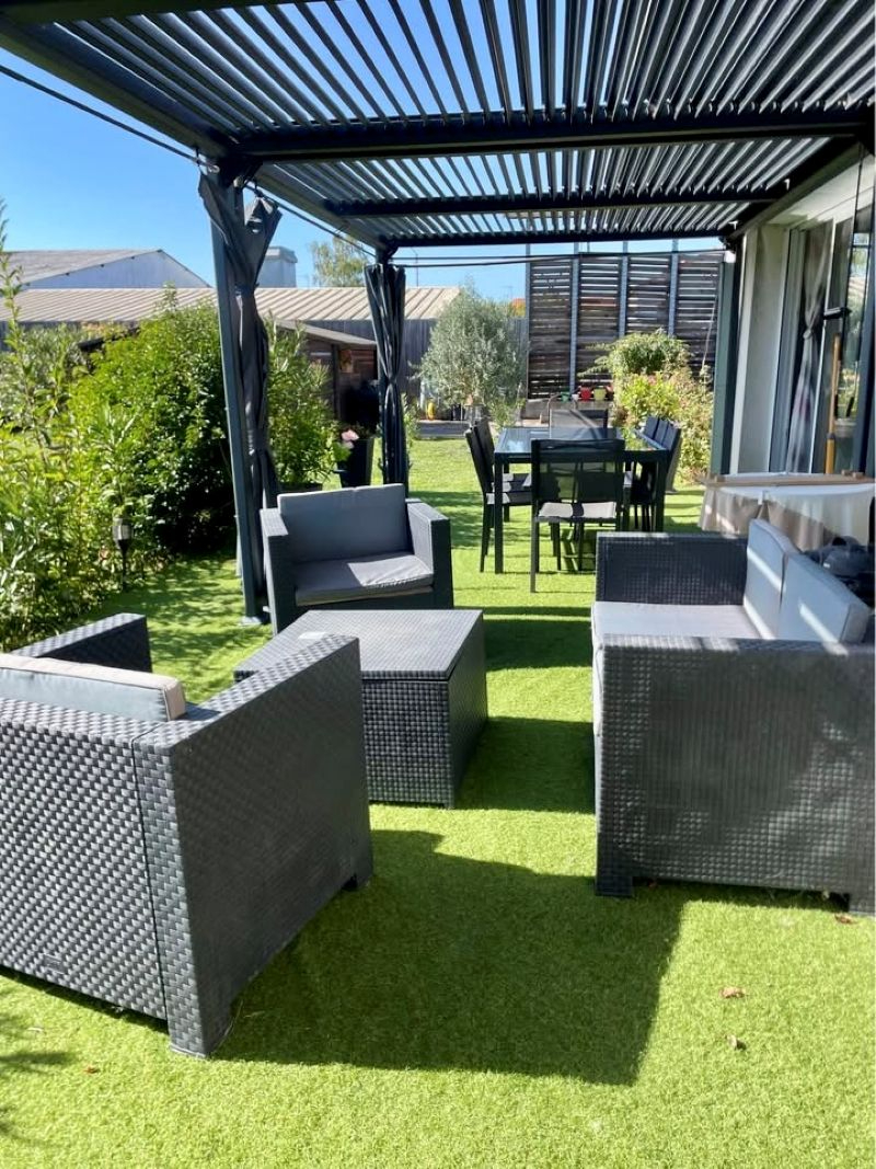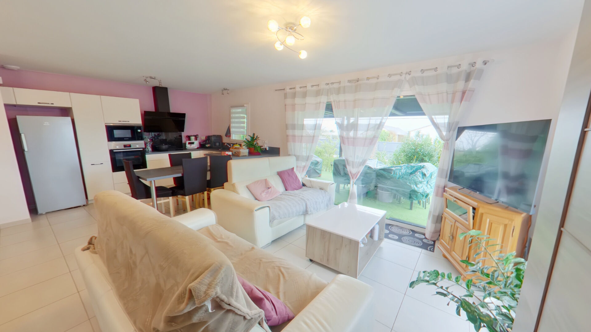 La grande pièce de vie, lumineuse et chaleureuse, s'ouvre sur une cuisine entièrement ouverte ainsi que sur les extérieurs, où vous profiterez d'une terrasse agréable prolongée par un carport.