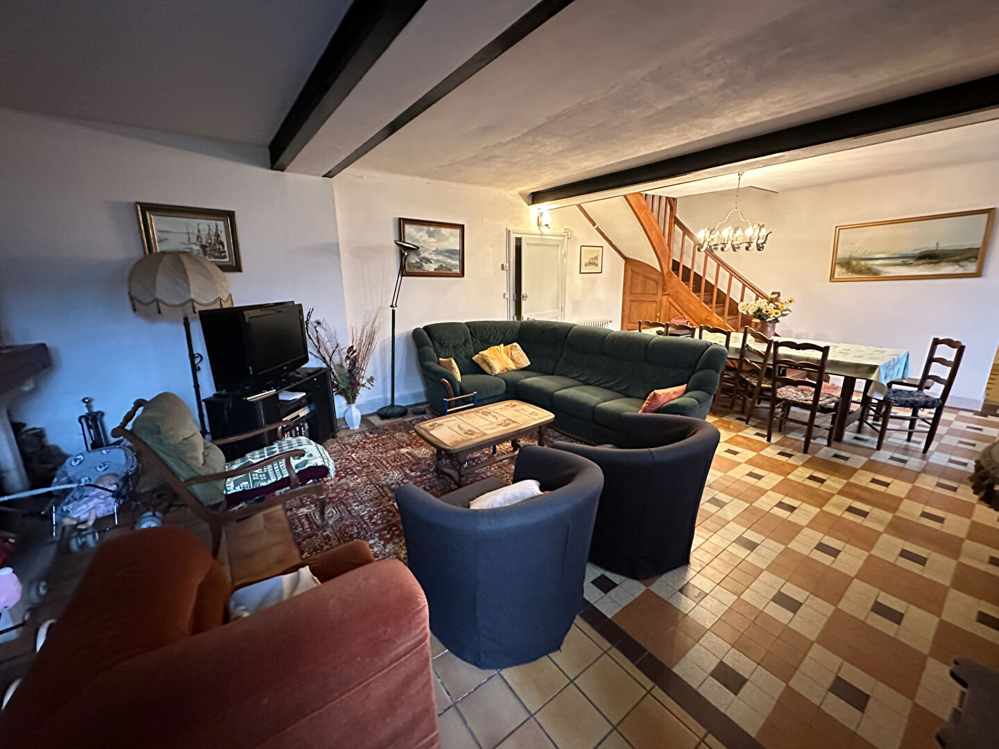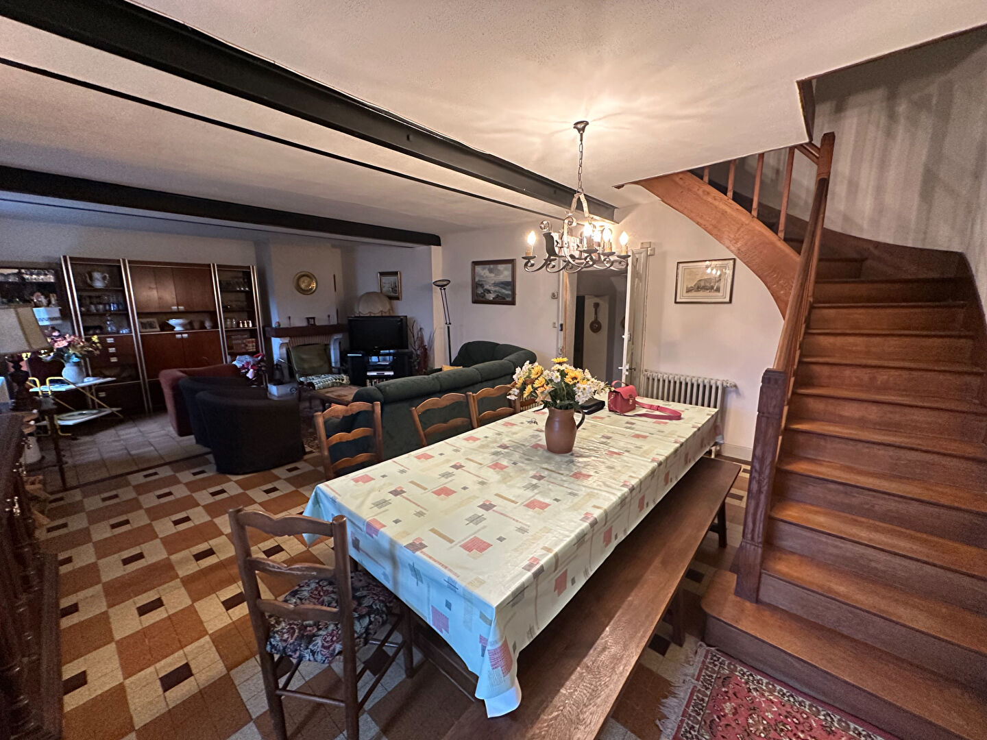 Au rez-de-chaussée : Un bel espace de vie chaleureux avec cheminée, une cuisine indépendante, trois chambres, une salle de bains.