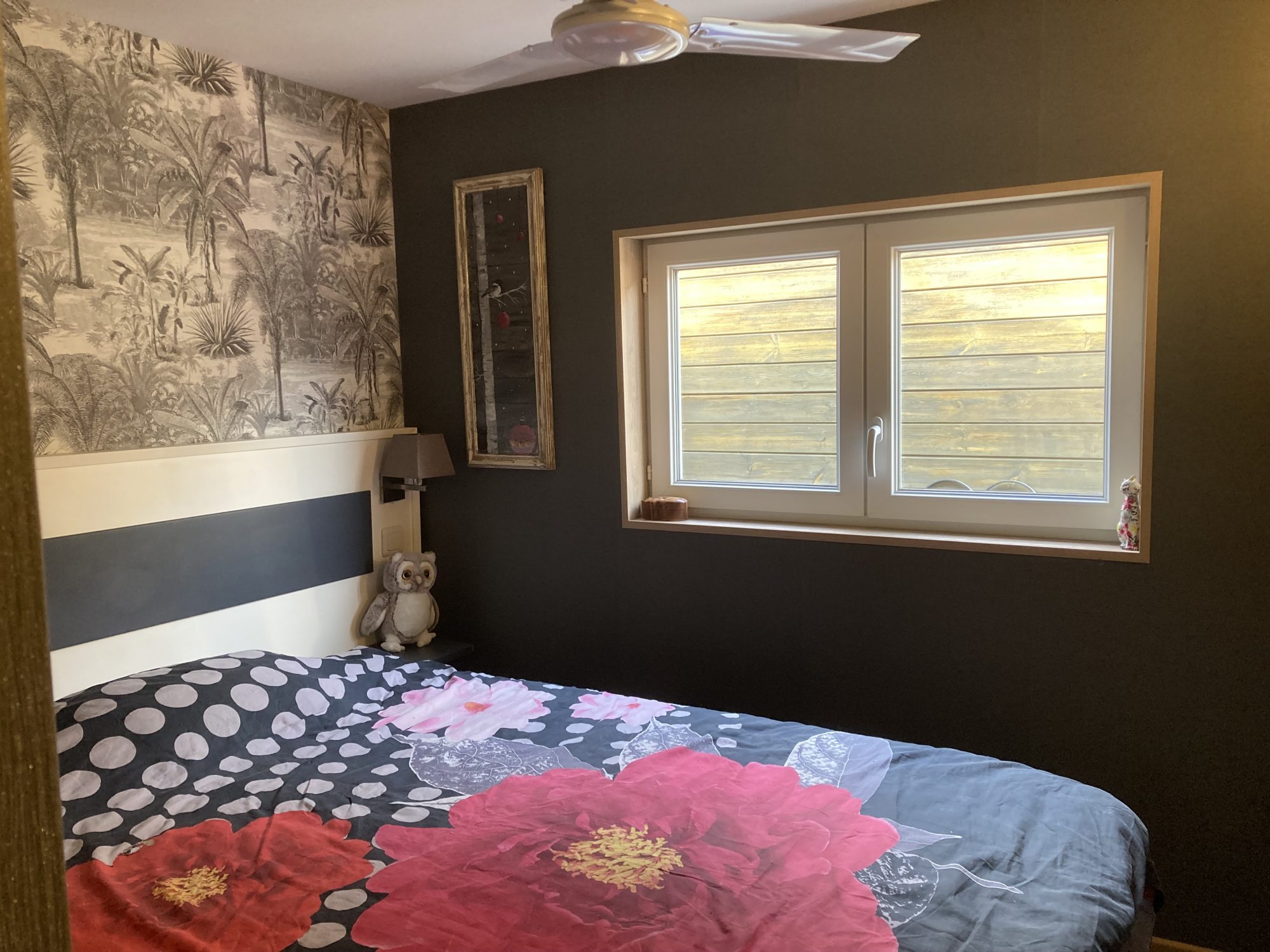 Totalement isolé des murs à la toiture et possédant la climatisation réversible, ce 'chalet' vous offre une agréable véranda aménagée en pièce de vie composée d'un coin salon, d'une cuisine moderne américaine entièrement équipée et d'un espace salle à manger.