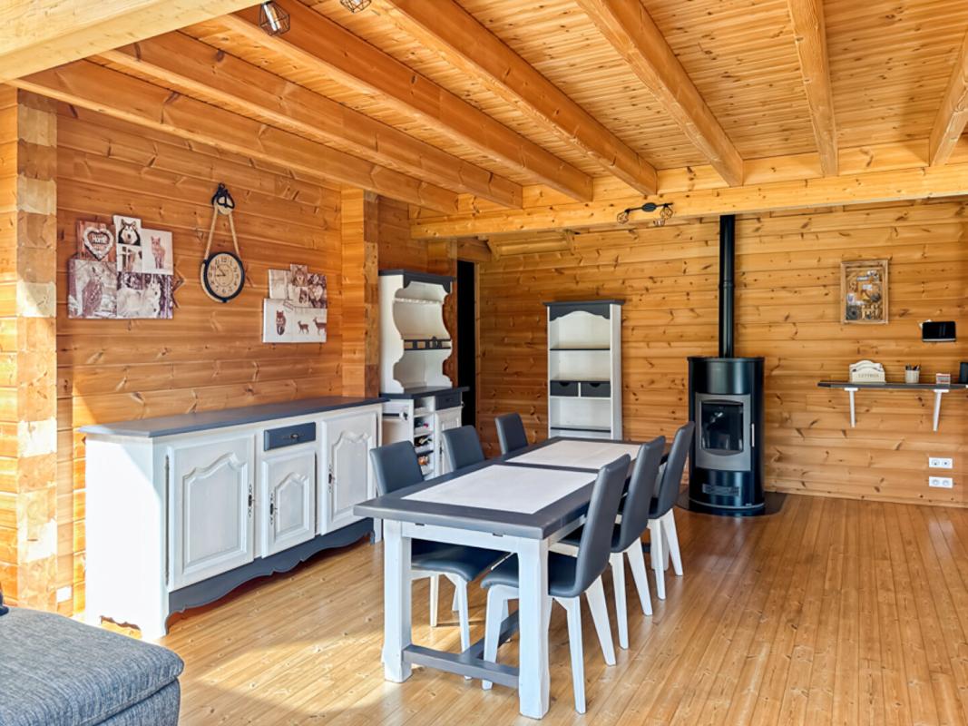 Véritable chalet finlandais de 2017 de construction KONTIO d'une superficie de 150m2 offrant au rez-de-chaussée entrée, cuisine aménagée et équipée ouverte sur le salon-séjour avec poêle à granulés, chambre avec dressing, salle d'eau avec douche à l'italienne, wc suspendu, buanderie.