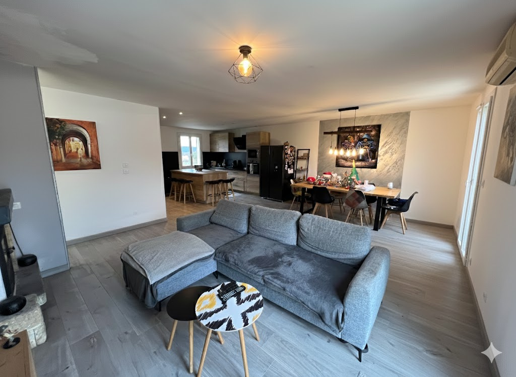La pièce de vie d'environ 48 m2 constitue le coeur de la maison. Baignée de lumière, elle se compose d'un salon chaleureux avec cheminée à insert, d'une cuisine ouverte moderne et d'une climatisation réversible. Cet espace spacieux et convivial est idéal pour partager des moments en famille ou entre amis.