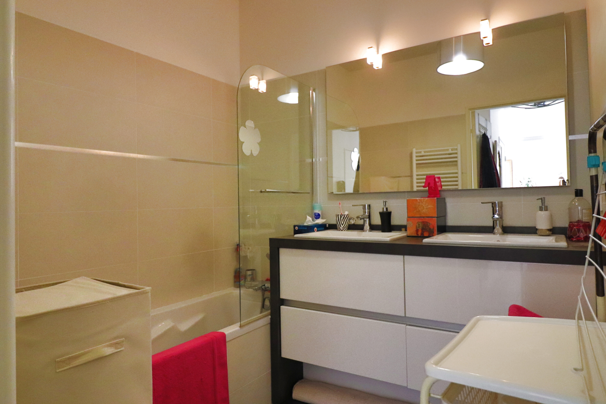 Cet appartement de 50.04m2 se compose d'une entrée, d'une chambre avec placards sur mesure, d'une salle de bain équipée d'une double vasque, d'une buanderie, d'un WC, ainsi qu'une cuisine semi-ouverte sur un séjour lumineux donnant accès à une tarrasse. Des rangement sur mesure sont également présents dans le salon.