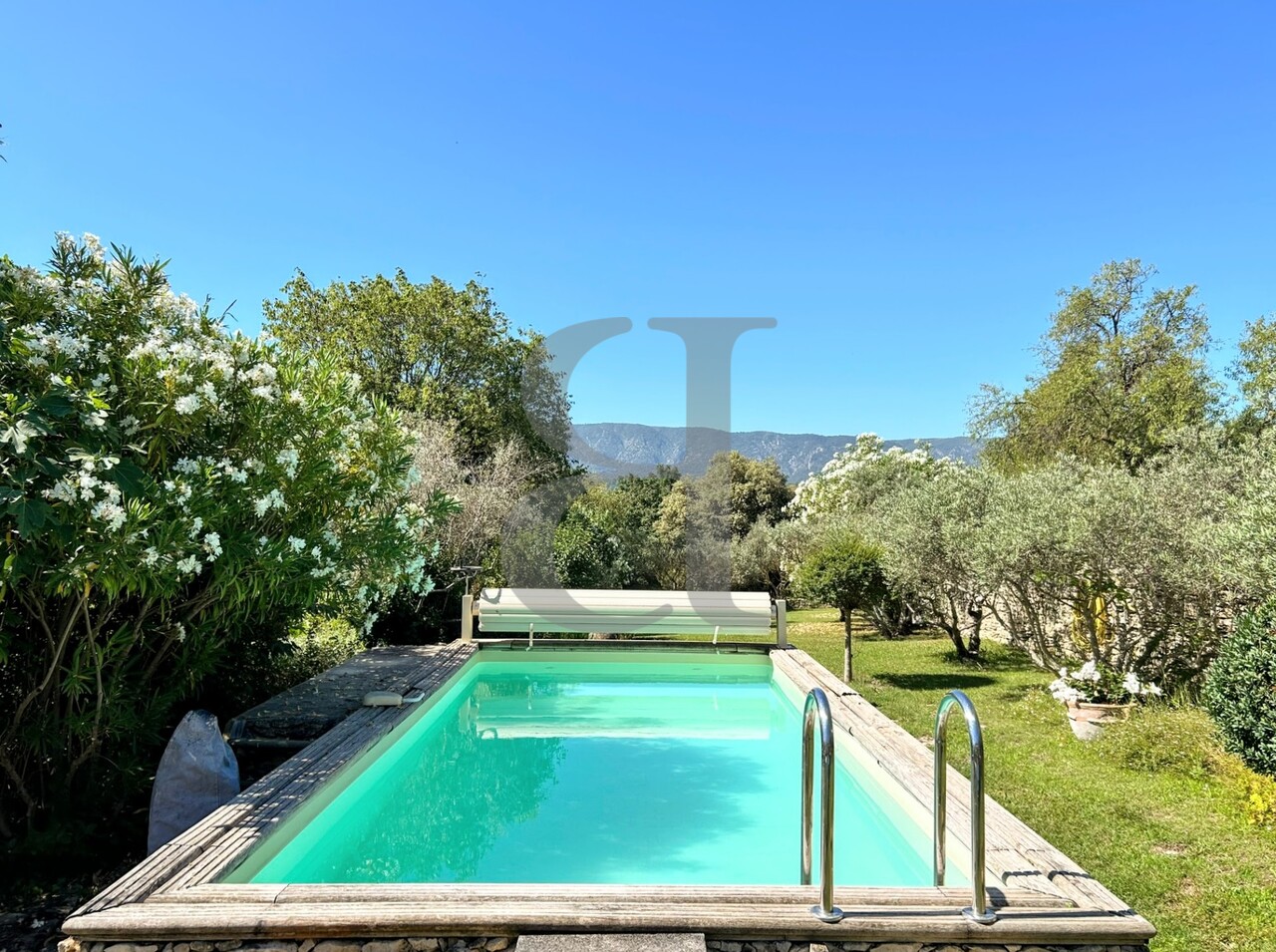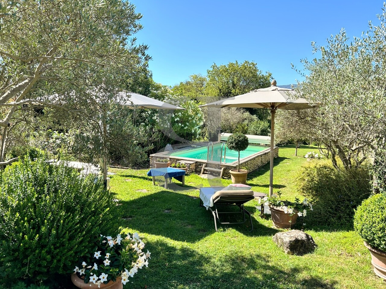 Le parc méditerranéen, planté d’oliviers et ouvert sur une vue dégagée, accueille une piscine propice à la détente. Plusieurs annexes, caves et un vaste garage complètent l’ensemble, offrant un potentiel d’aménagement exceptionnel : créations de gîtes, espaces de réception ou développement d’une activité touristique.