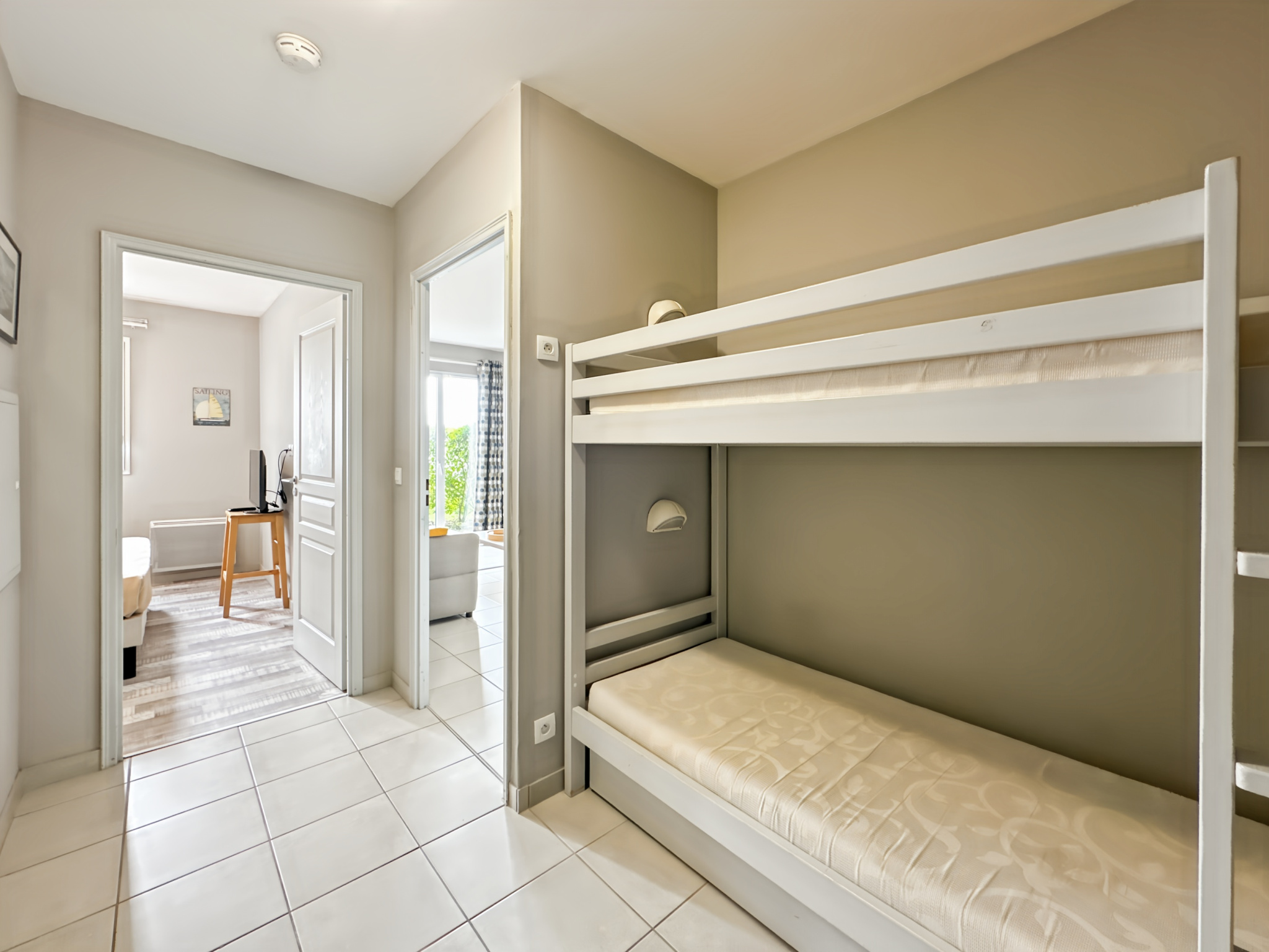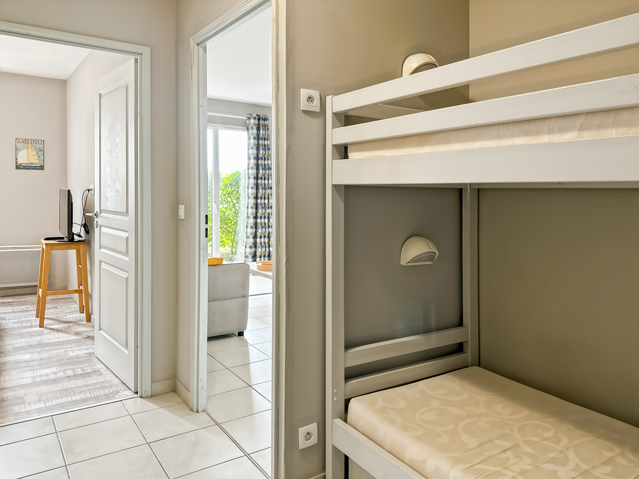 L'entrée dessert une pièce de vie d'environ 17 m2 avec kitchenette,avec une terrasse privative d'environ 6 m2, une chambre, une salle de bains, deux lits simples superposés et un WC indépendant.