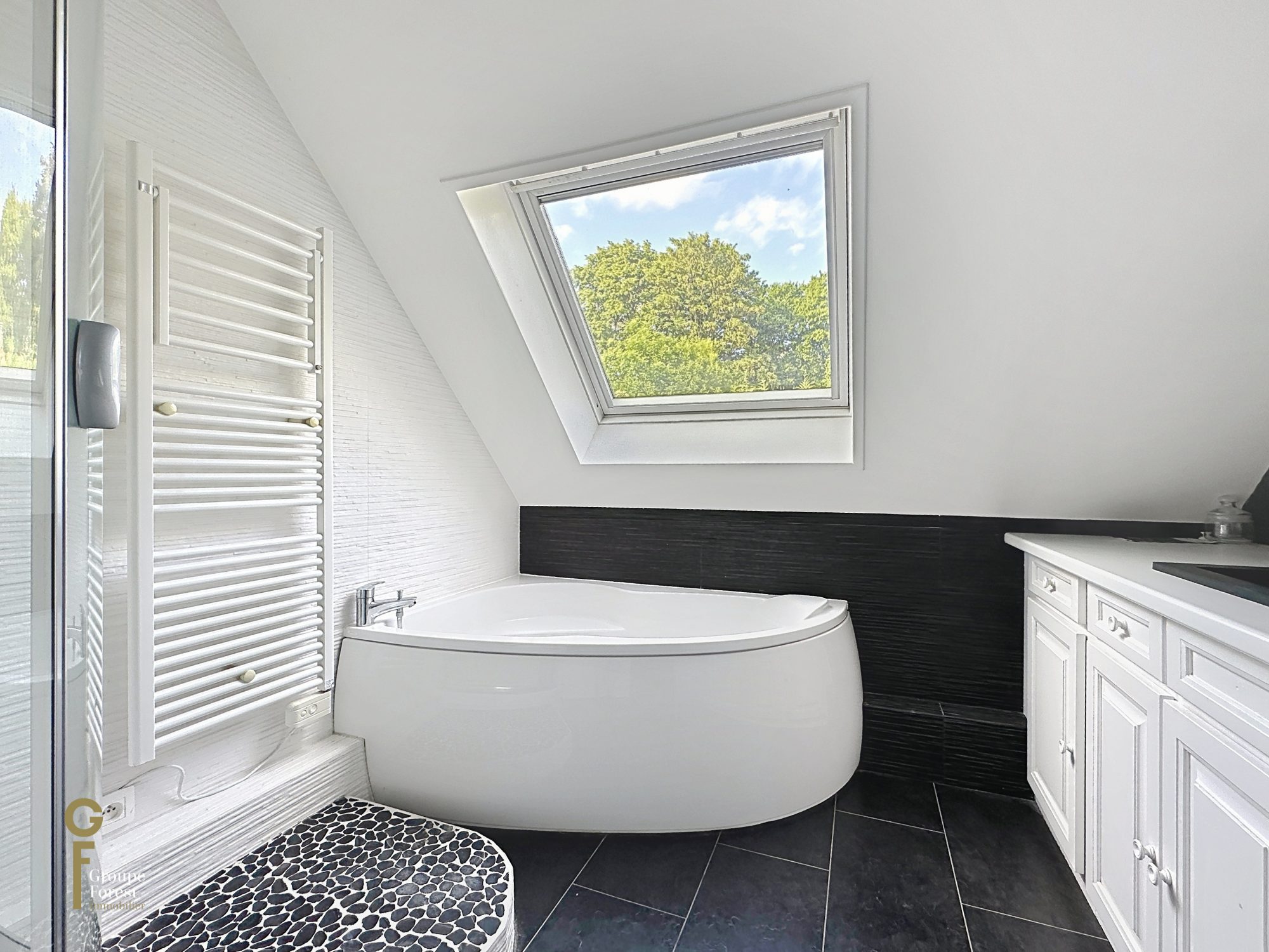 Le premier étage dessert quatre chambres dont trois pourvues de placards et une salle de bains complète avec baignoire, douche et deux vasques.