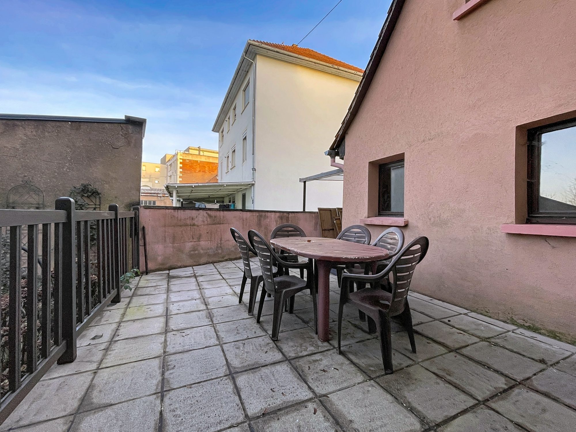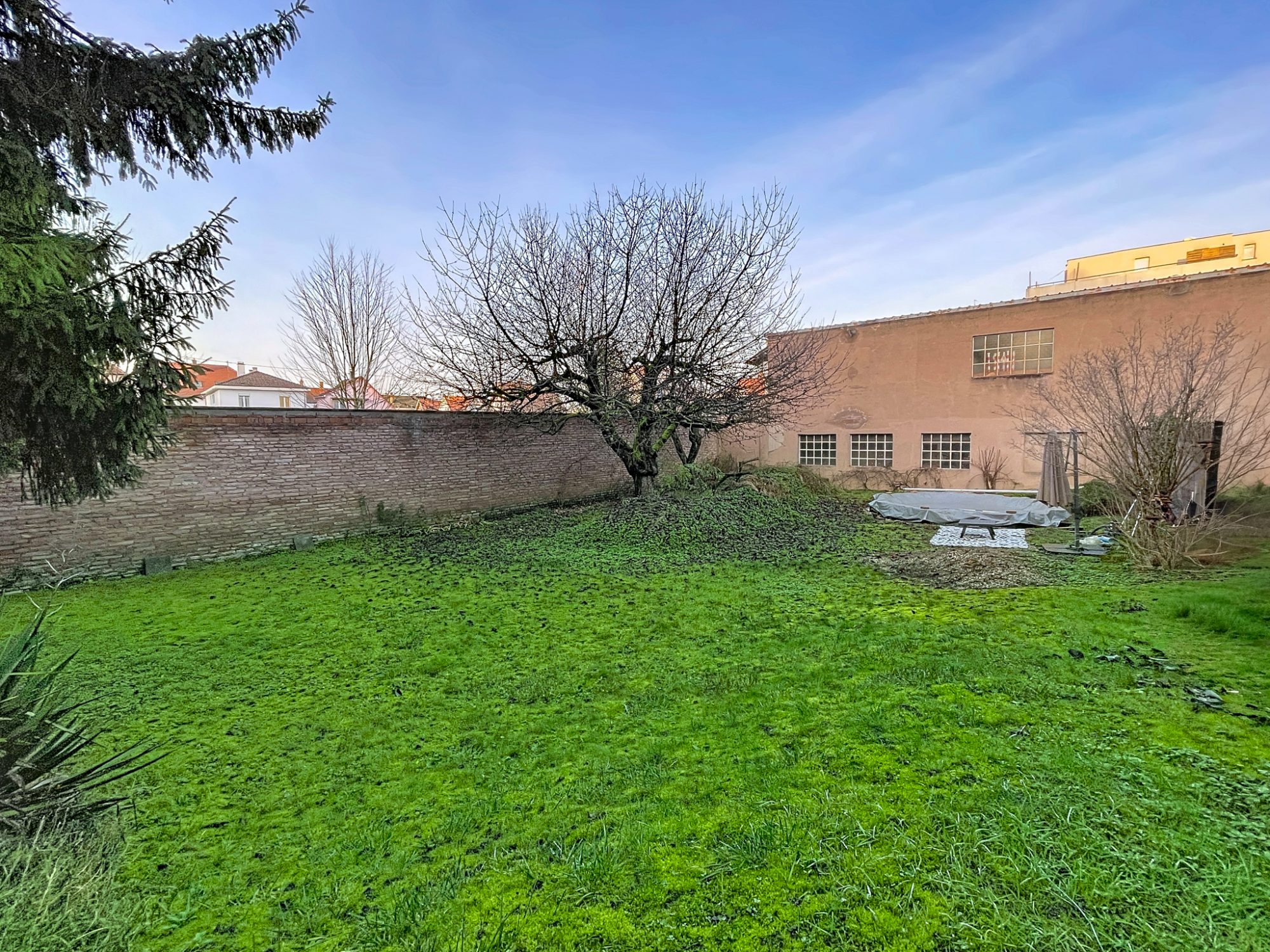De plus, la maison dispose d'une cour, d'un garage, de deux terrasses sur deux niveaux différents et d'un très beau jardin avec piscine semi-enterrée à l'arrière.