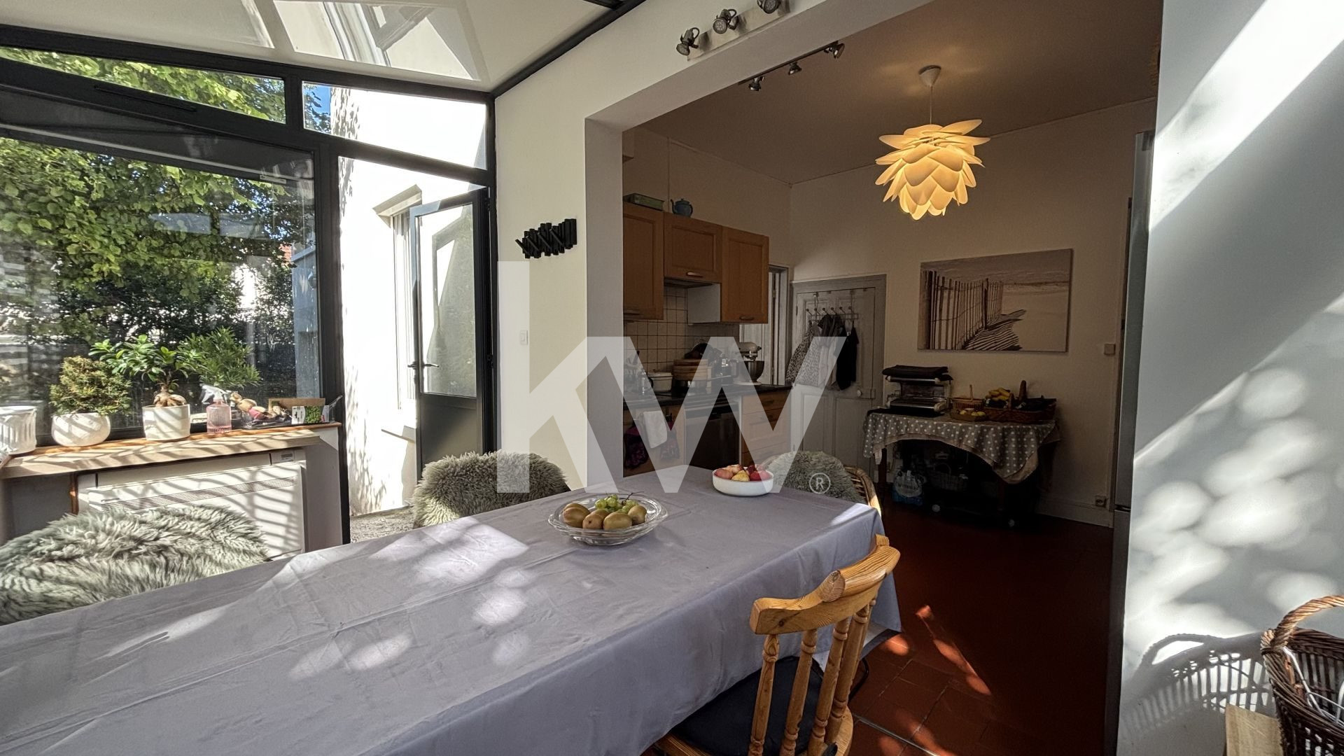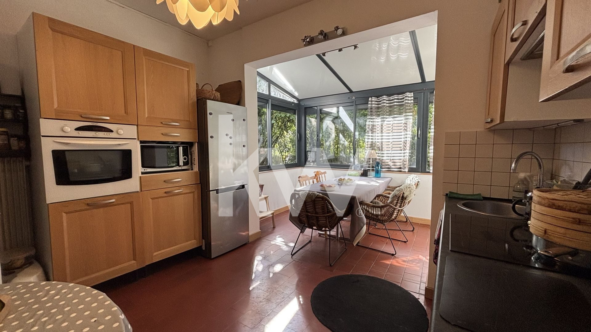 véranda donnant sur le jardin arboré de 400 m², parfait pour les repas d'été et la détente.