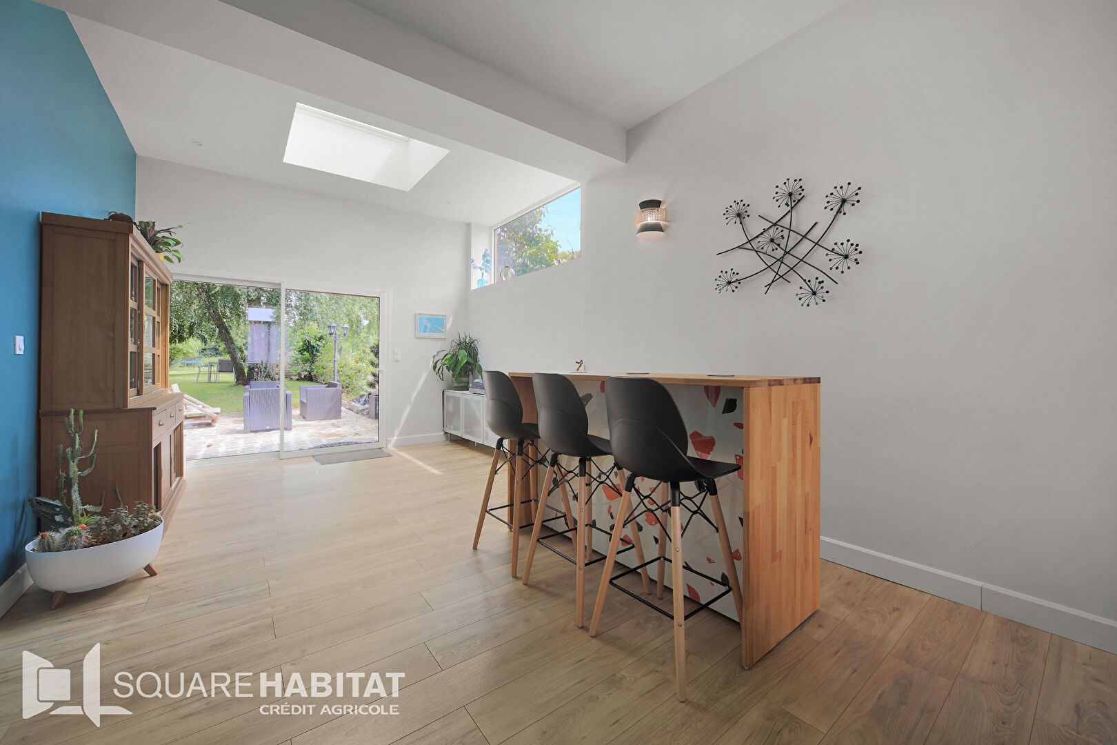 Sur la droite, vous découvrez une vaste pièce de vie baignée de lumière, ouverte sur le jardin et sur la nature environnante : un vrai cocon tourné vers l'extérieur.