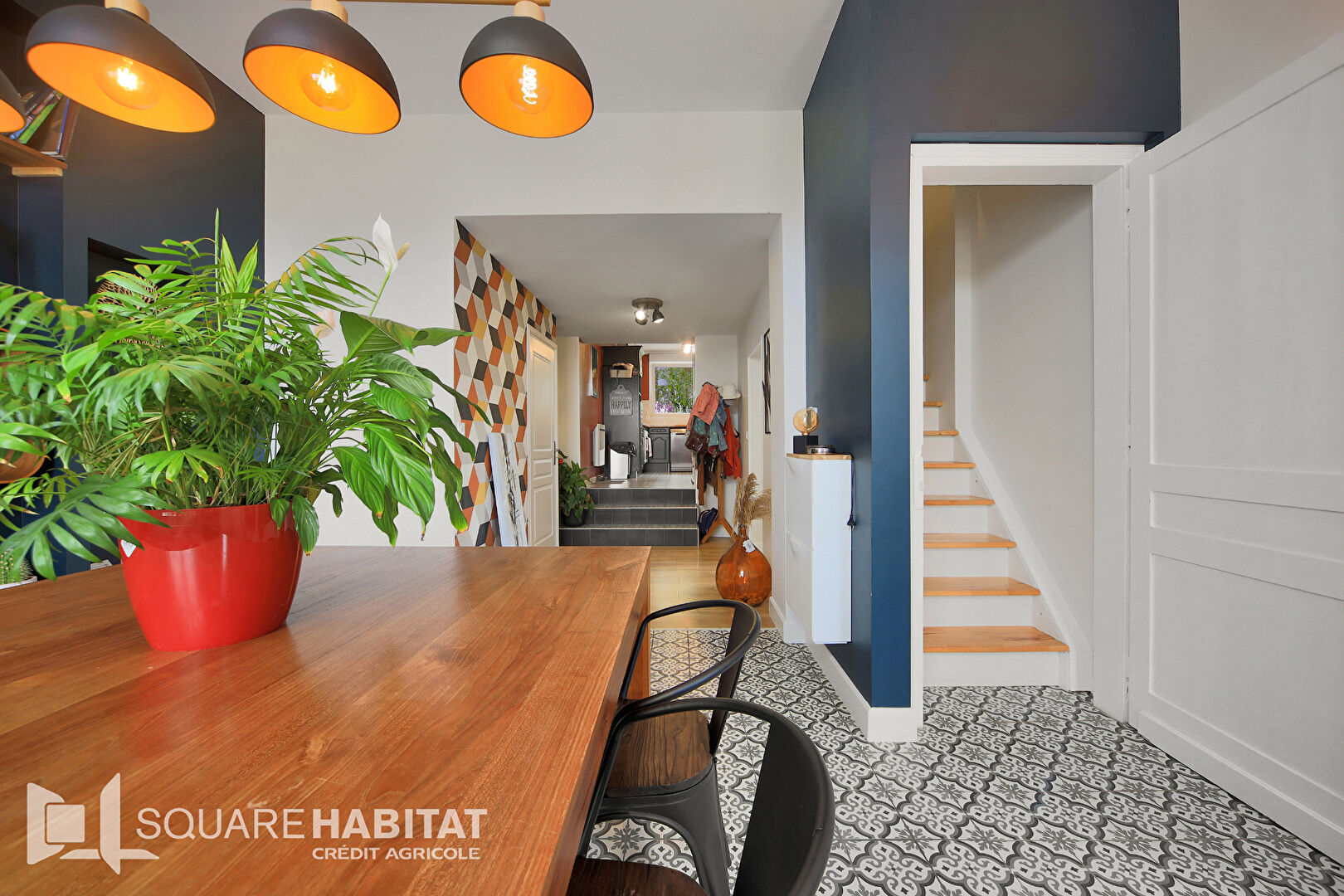 Dès l'entrée, vous accédez à une grande pièce salle à manger avec cuisine surélevée, pleine de caractère.